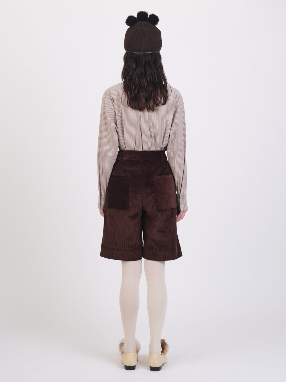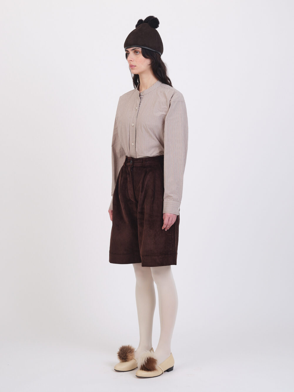 The Mara Short in an 8 Wale British Cord is a wide leg short featuring side pockets and back patch pockets, a concealed button fly, and beltloops.