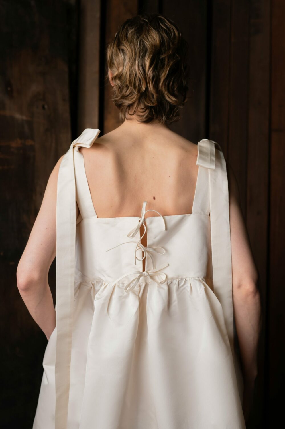 The Big Bow Dress is an oversized, over-the-head style with a gathered waistline, sweet three-bow closure at the back, and adjustable bow straps with long ribbon tails, allowing you to tie the straps to any length desired with the bow in the best position for you. In a thick smooth silk taffeta woven in India with side seam pockets.