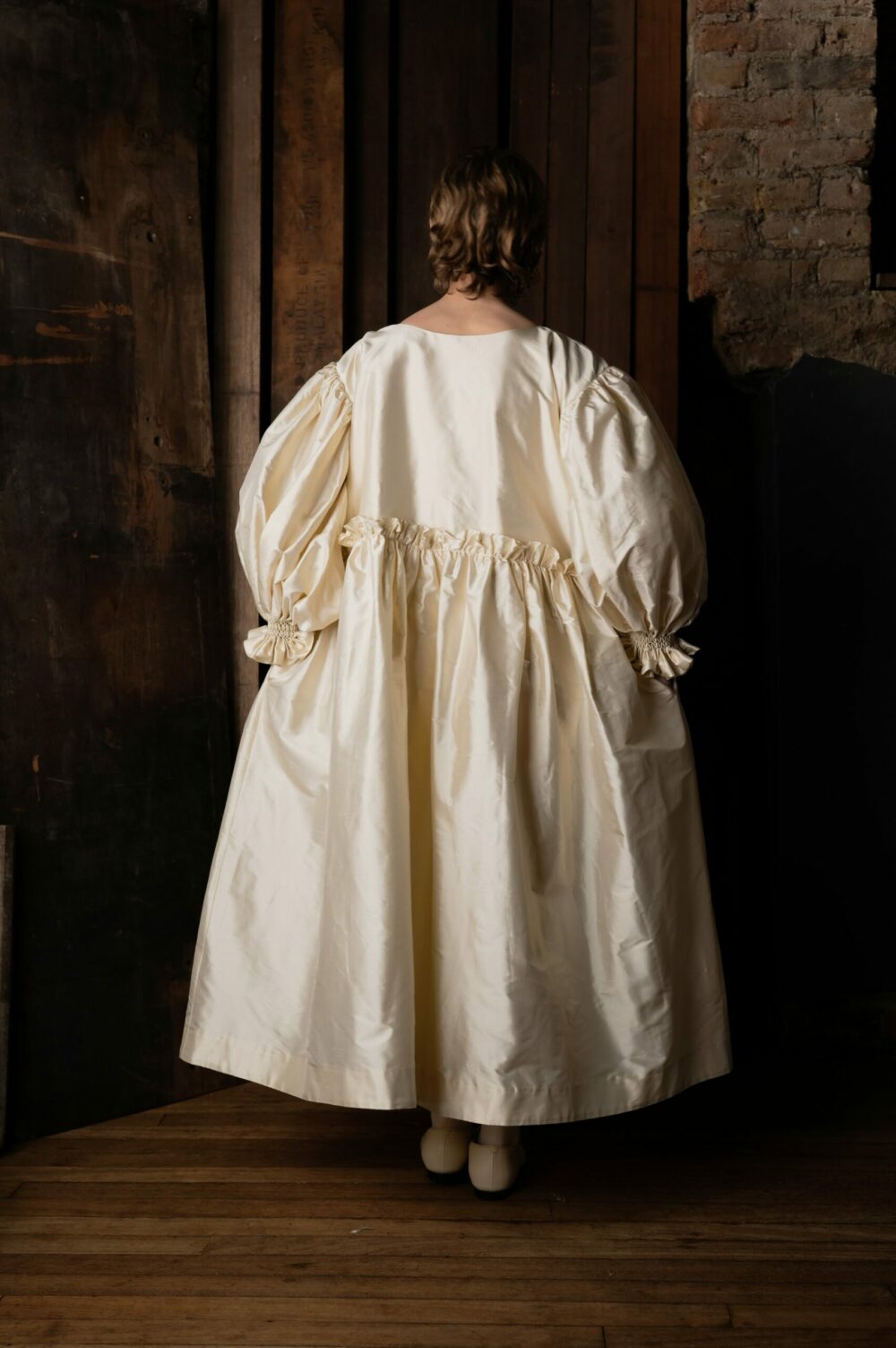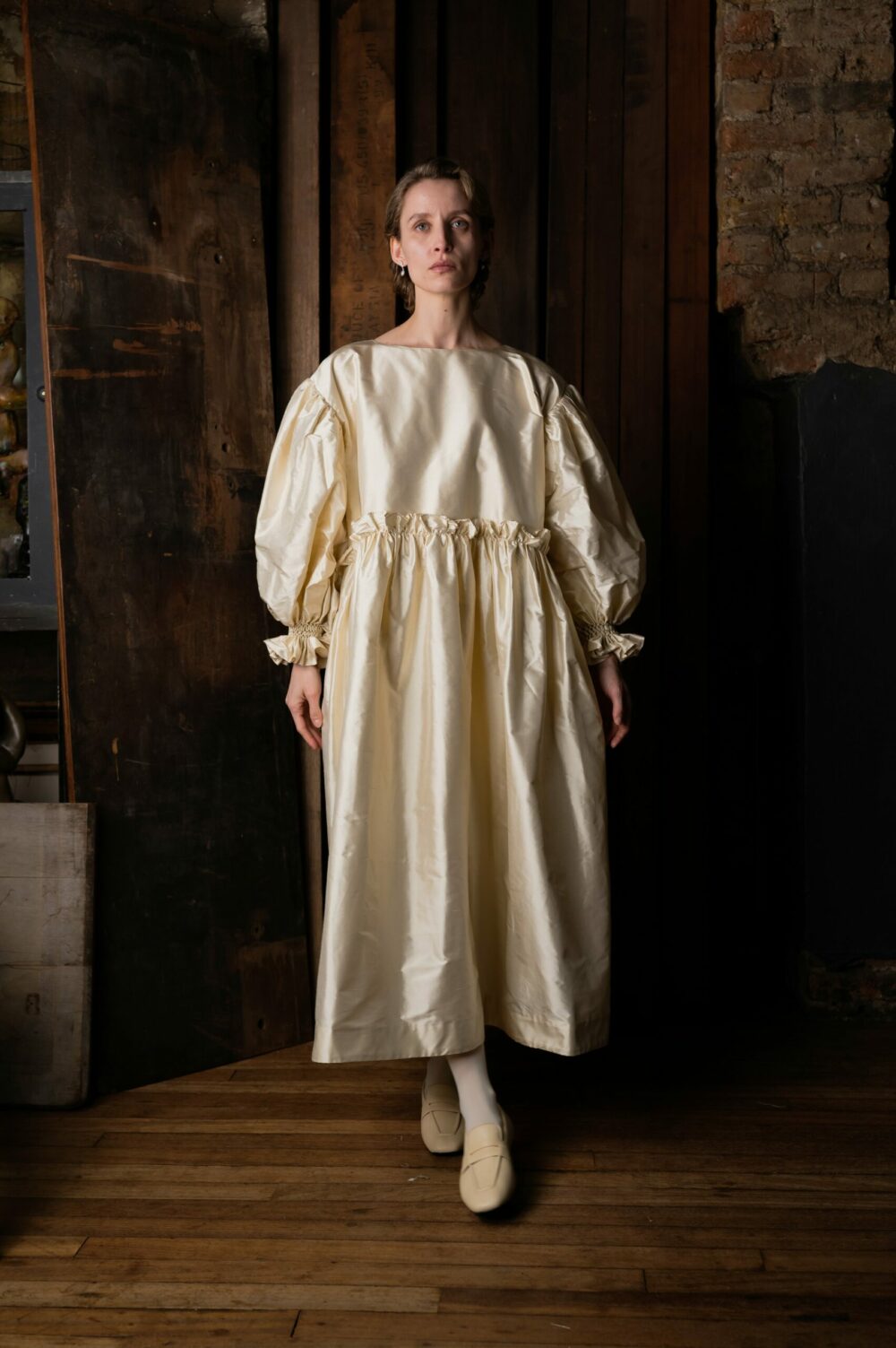 The Smocked Sleeve Dress is an oversized, over-the-head style dress with a gathered ruffle waistline and dropped shoulders. Featuring hand-gathered and hand-smocked cuffs, a Cawley signature. In a smooth silk dupion woven in India.