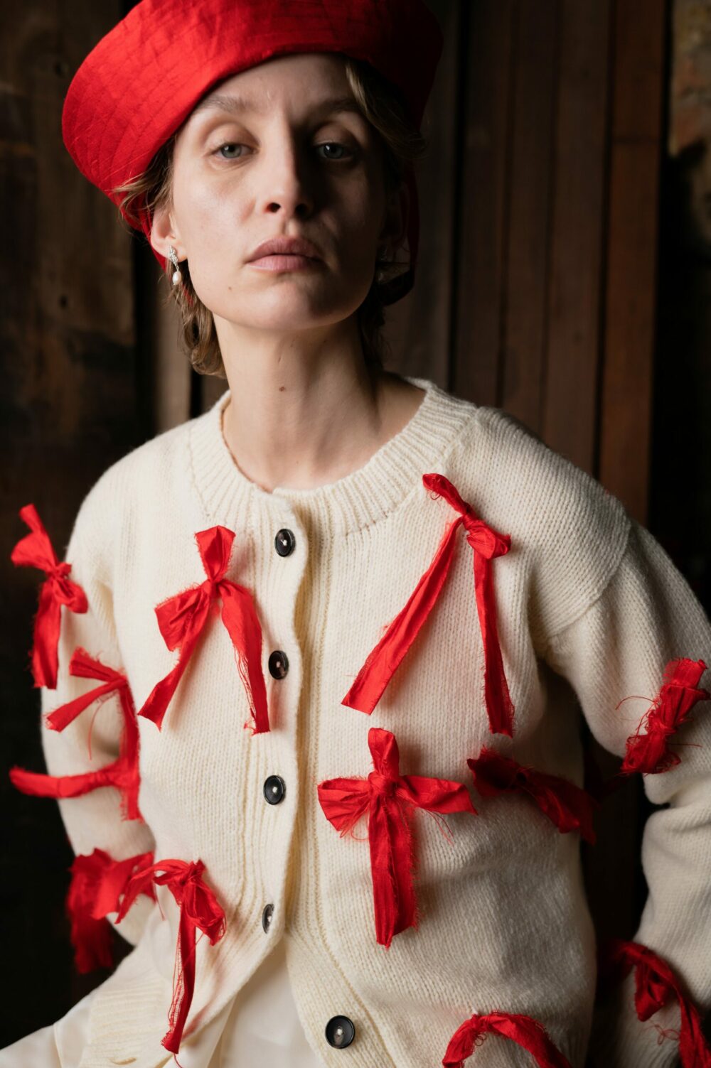 The Bow Cardigan is our classic Rosa Cardigan adorned with hand-tied silk bows. In soft British Lambswool with bows of smooth Indian silk dupion and horn buttons. The perfect warmer layer for your wedding look.