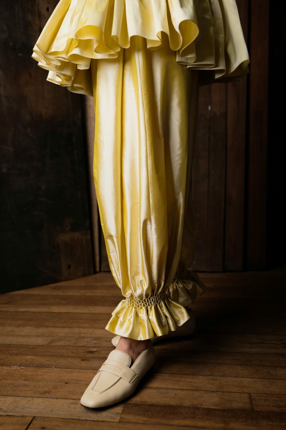 The Bridal Smocked Trouser is an oversized baloon shaped leg with hand-gathered and hand-smocked cuff hems, a Cawley signature. In a smooth silk dupion woven in India with an adjustable drawstring waist. The trouser pairs perfectly with the Bridal Smocked Jacket, creating a beautiful wedding suit.