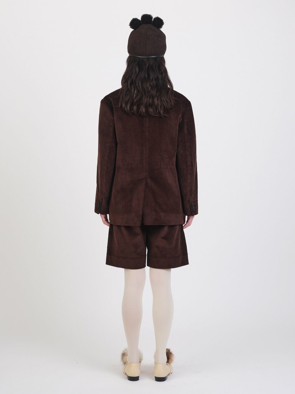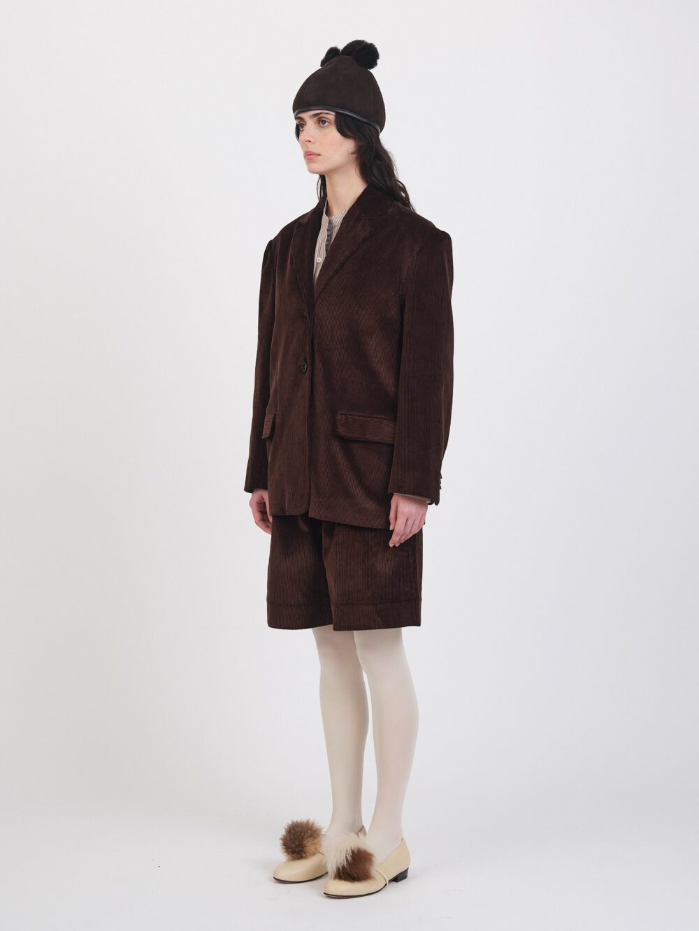 The Andie Blazer in an 8 wale British cord. A slightly boxy fit with oversized shoulders, featuring two front flap pockets and a back vent.