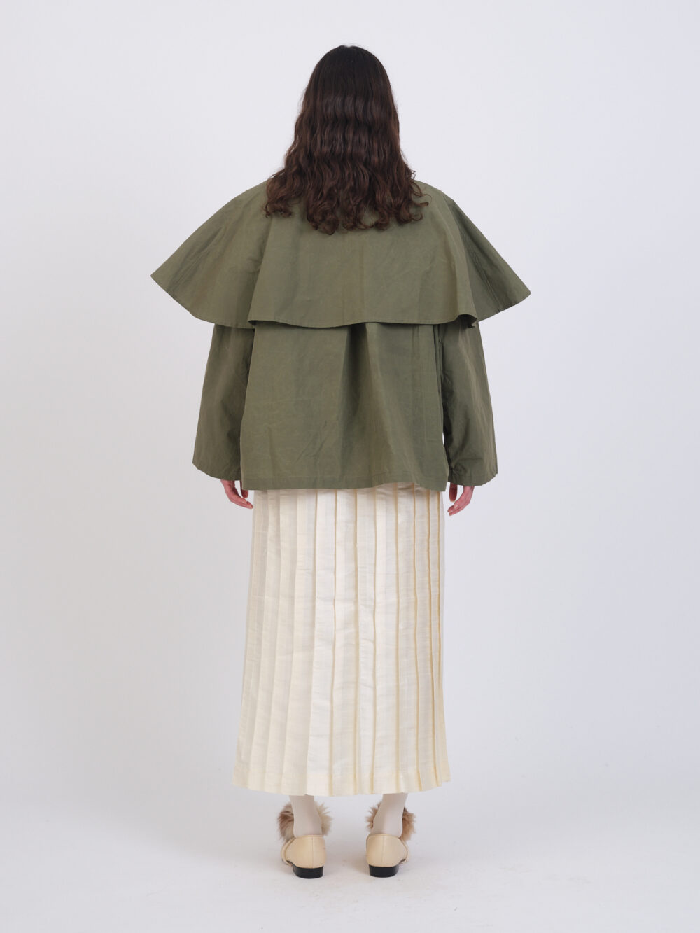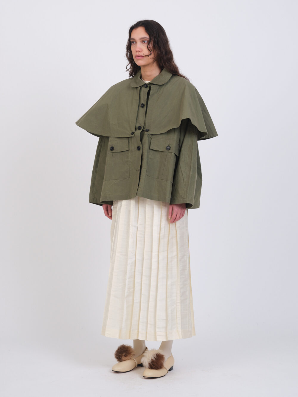 The Alma Mac features a removable cape, front patch pockets with button down pocket flaps, and a rounded collar.