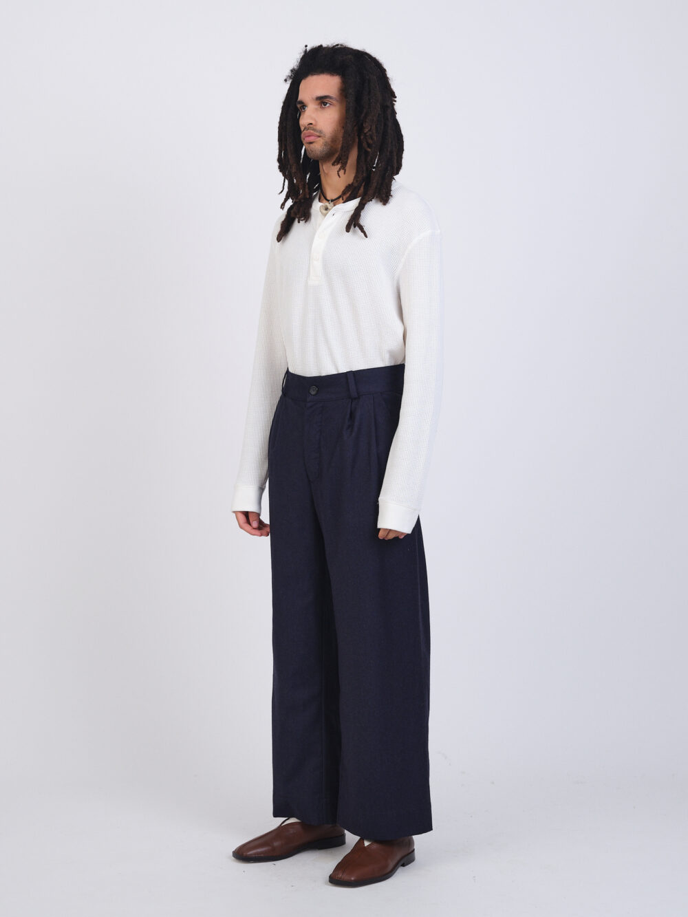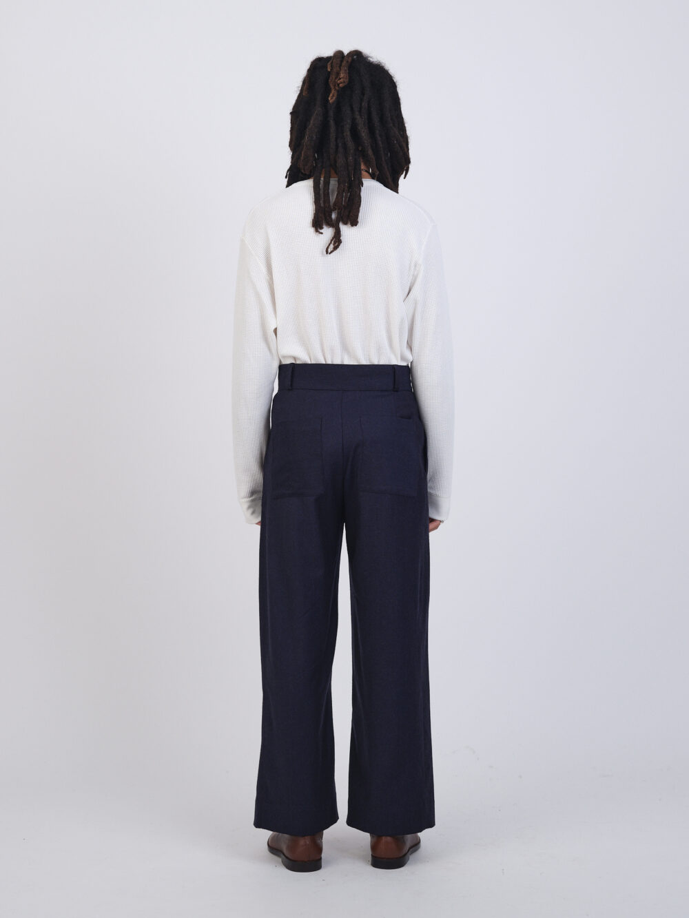 The Willa Trouser in a British flannel wool. A straight leg style, featuring front pleats, side pockets, back patch pockets, belt loops and hidden button fly.