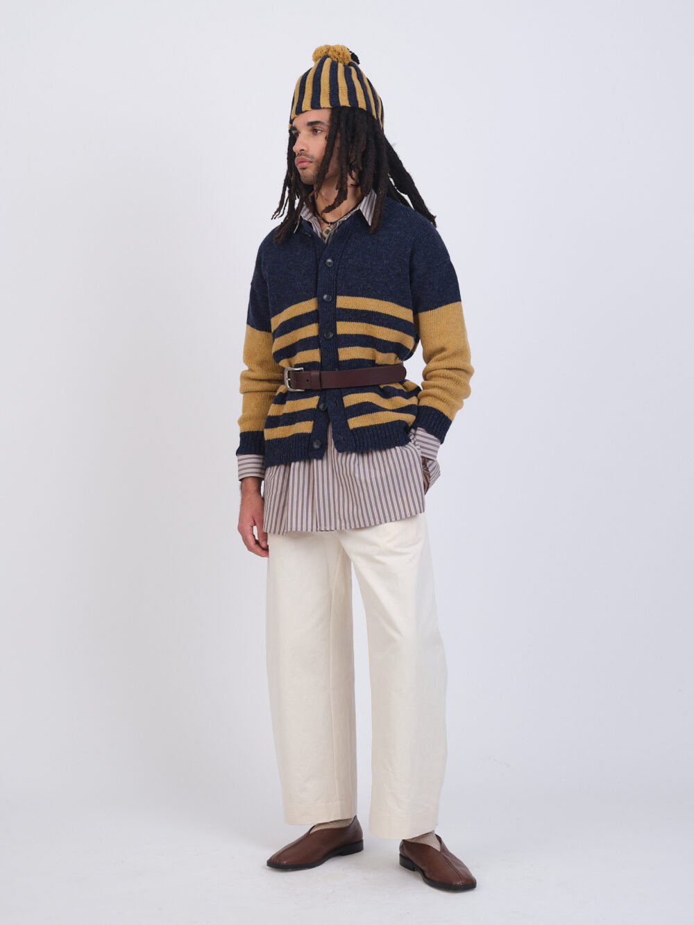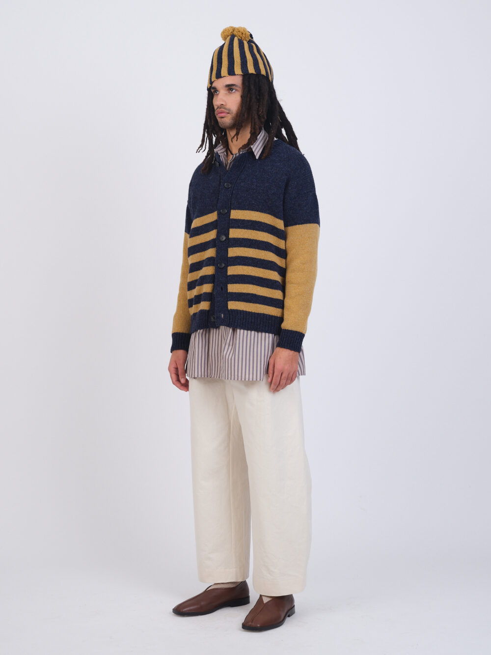 The men’s version of our classic Rosa Cardigan, the Elliot Cardigan features contrasting stripes and sleeves and button closure.