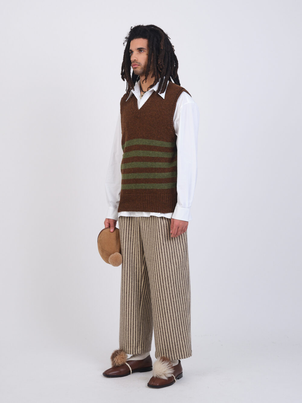 The Morris Vest is a classic men’s sweater vest, featuring contrasting stripes and a v-neck.