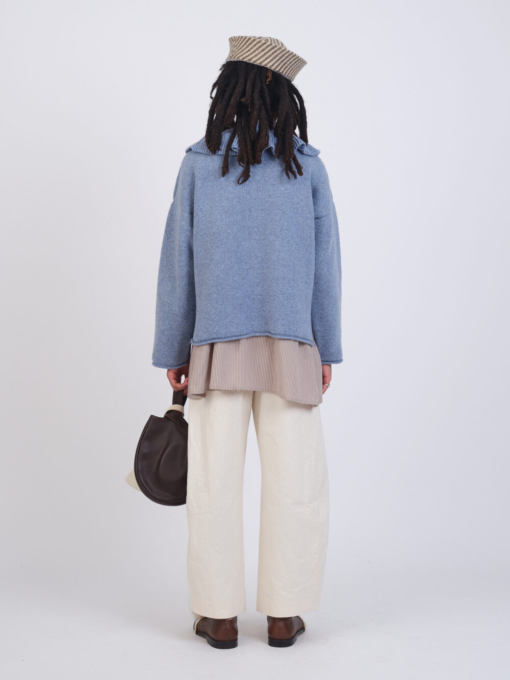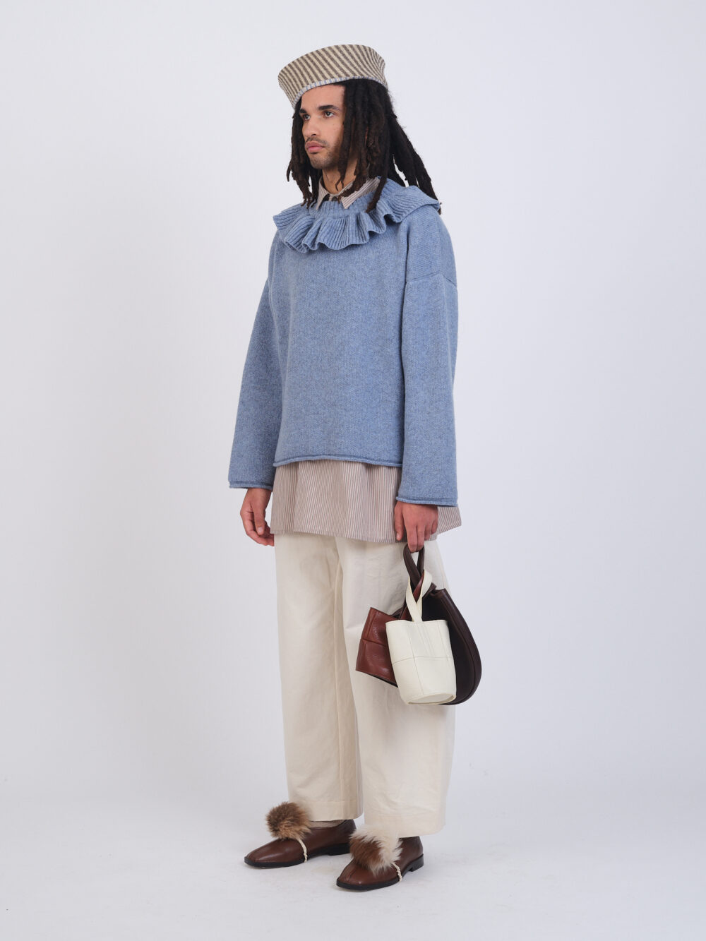 A new style for this season, the Ruffle Jumper is an oversized sweater in British wool with a crewneck and playful ruffle detail around the neckline.