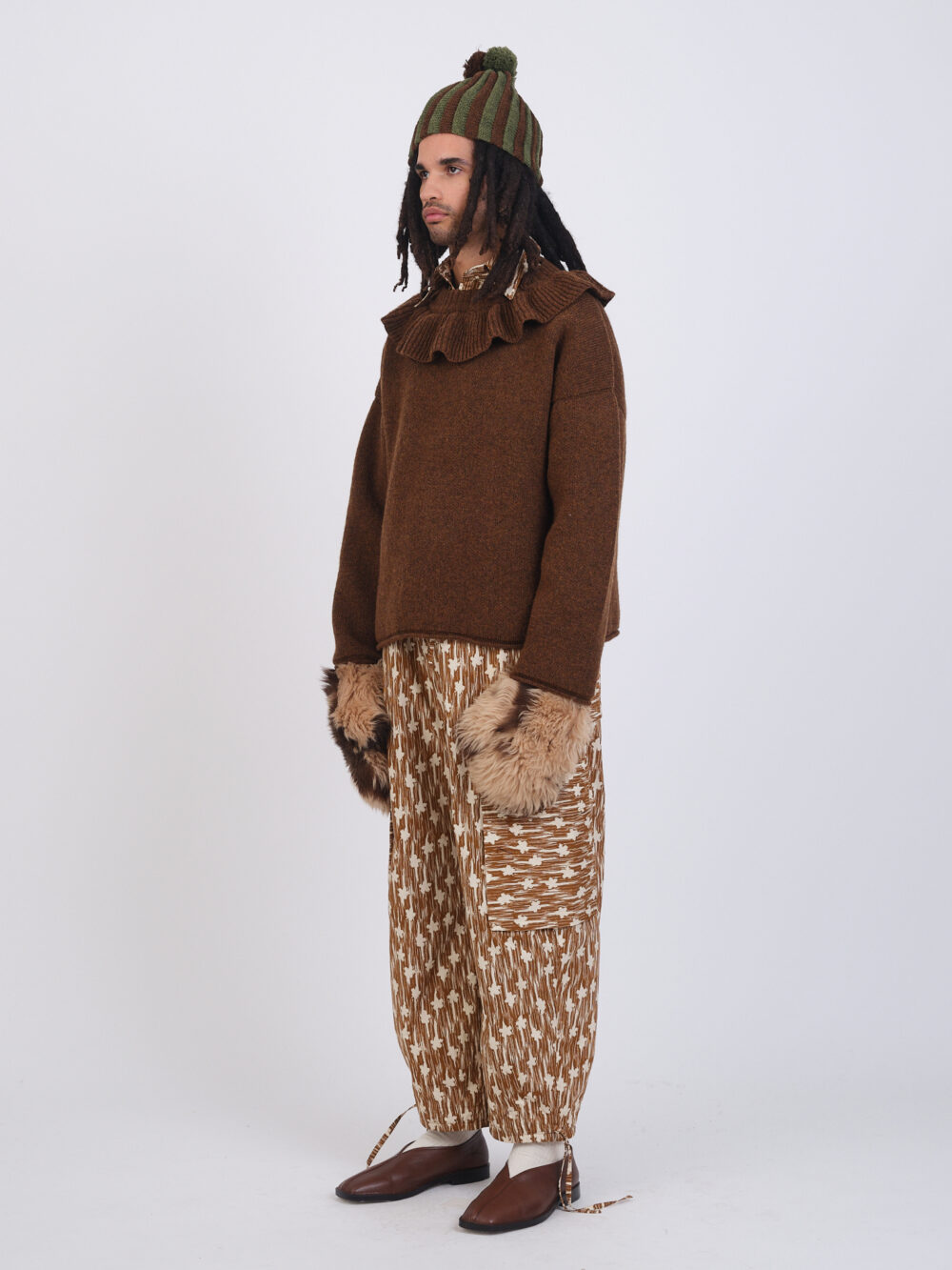 A new style for this season, the Ruffle Jumper is an oversized sweater in British wool with a crewneck and playful ruffle detail around the neckline.