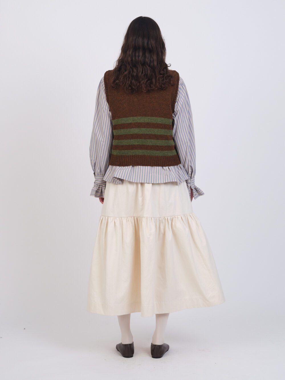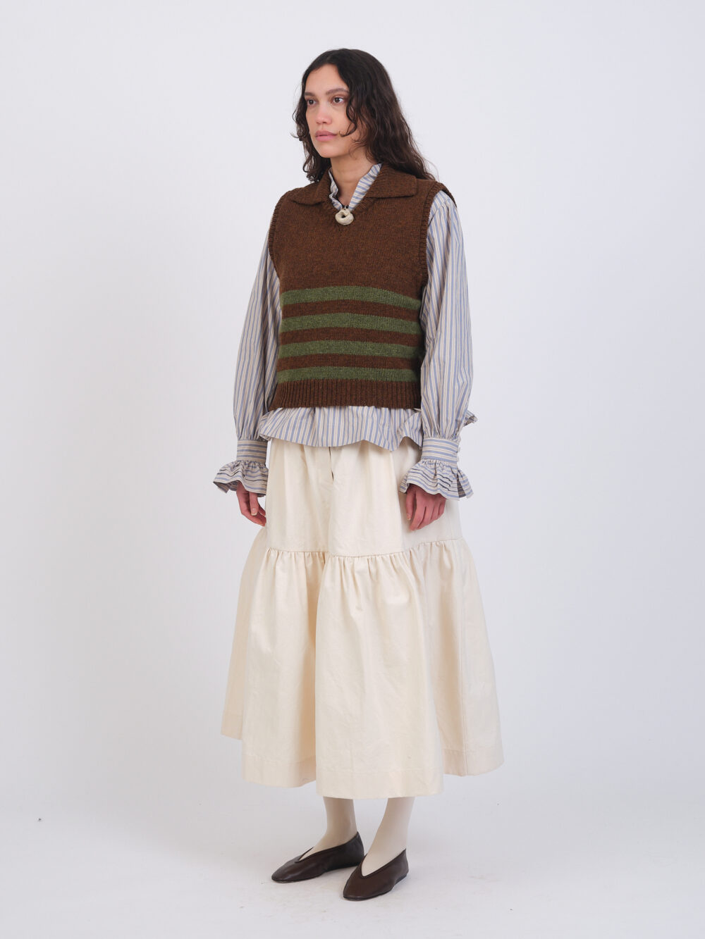 Our classic British Lambswool Violet Vest is a boxy, oversized shape with a knitted collar and contrasting stripes.