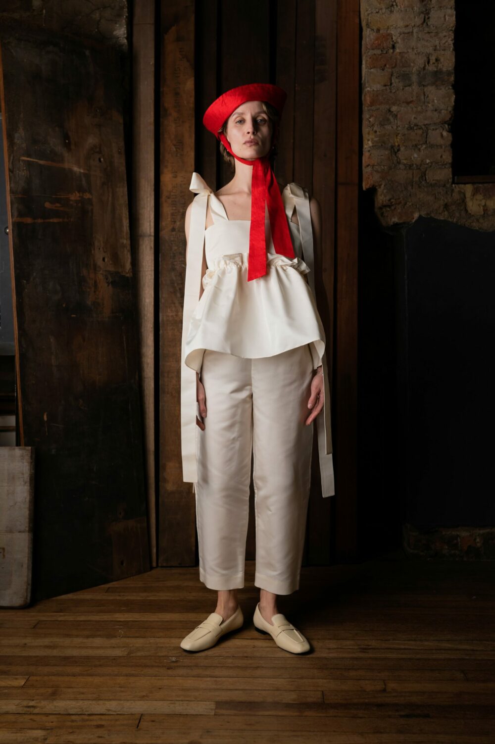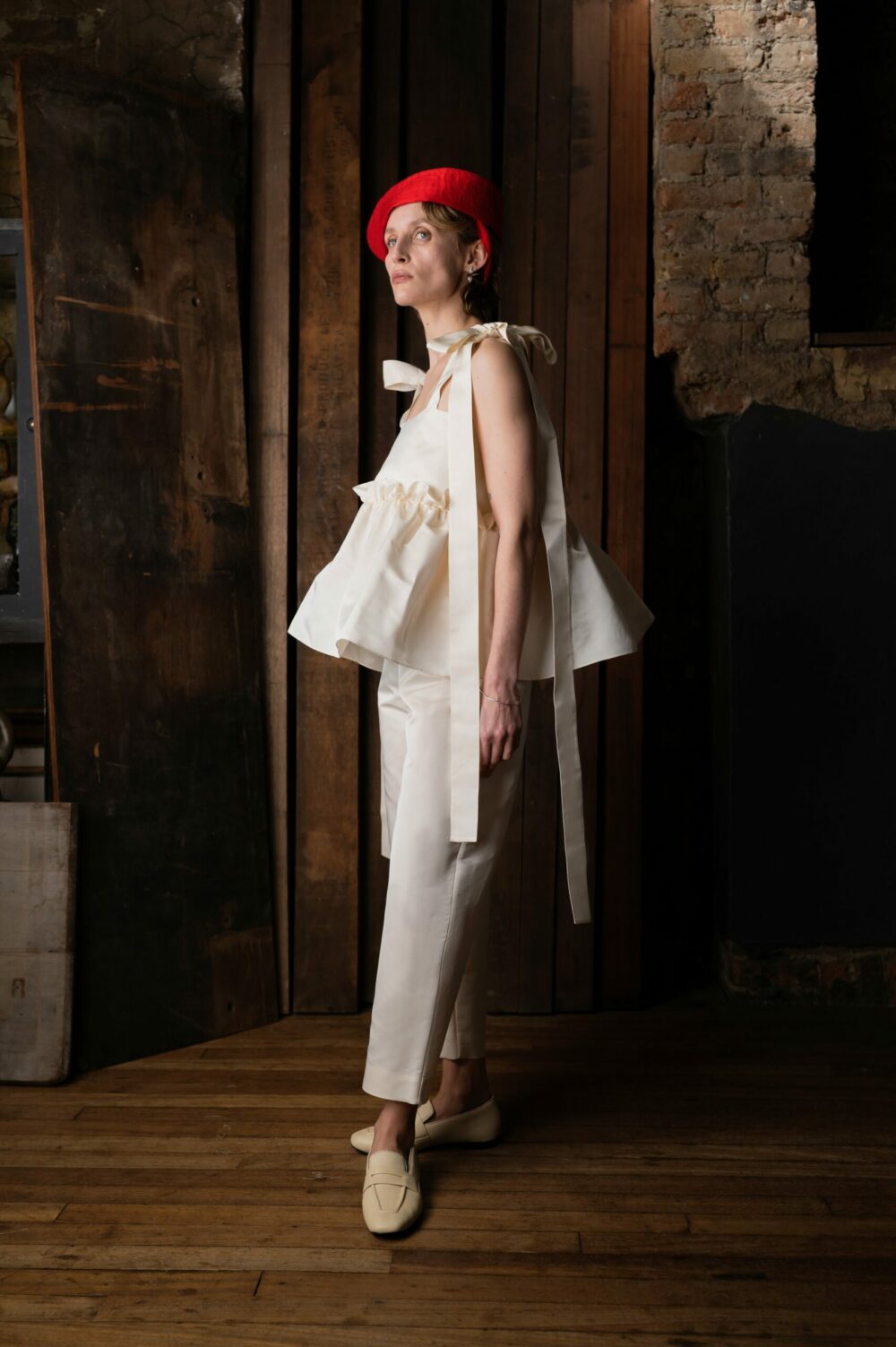 The Cigar Trouser is a tapered style leg with front and back darts sitting high on the waist to create a flattering silhouette. In a thick smooth taffeta woven in India with a hidden side seam closure. The trousers pair perfectly with the Big Bow Top to create a modern wedding ensemble.
