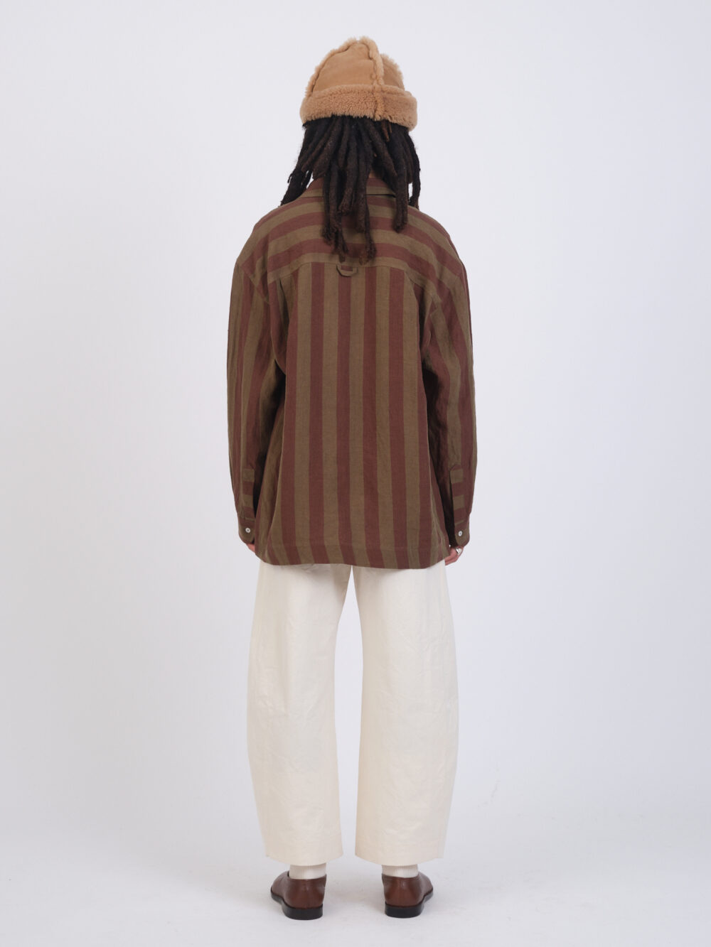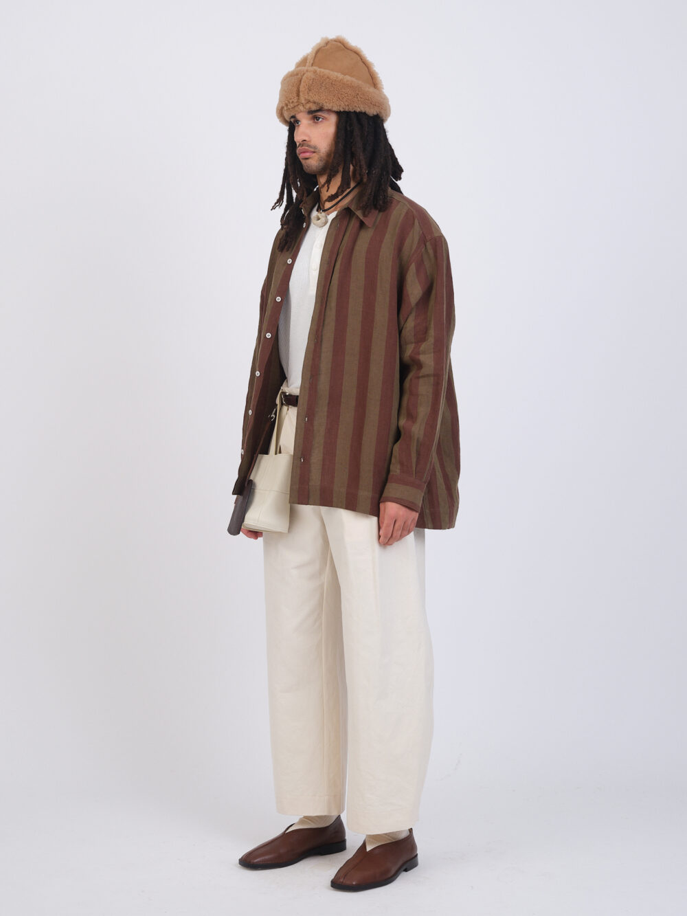 A classic men’s button down, the Players shirt is a slightly oversized style in Irish striped linen with button closure.