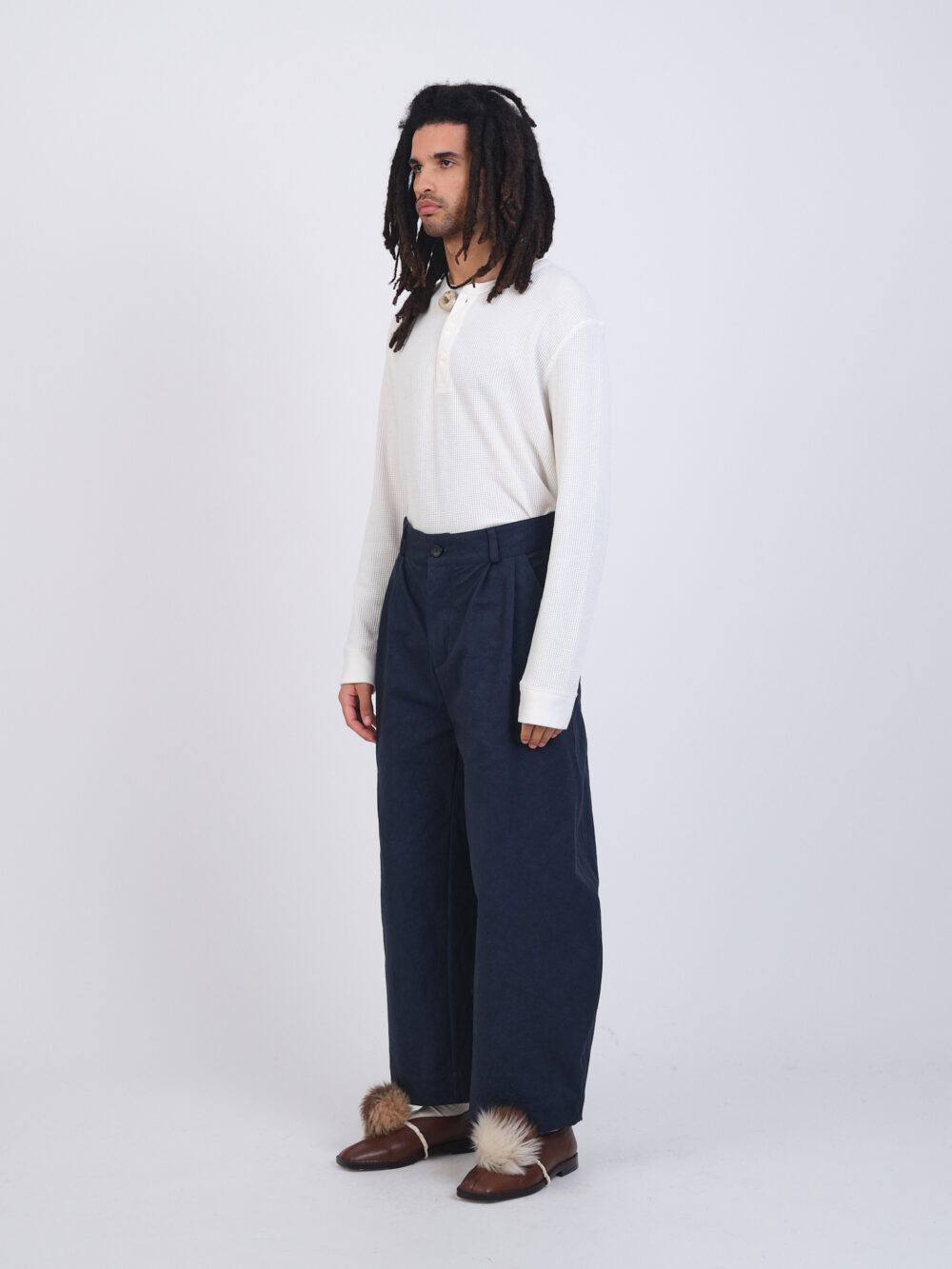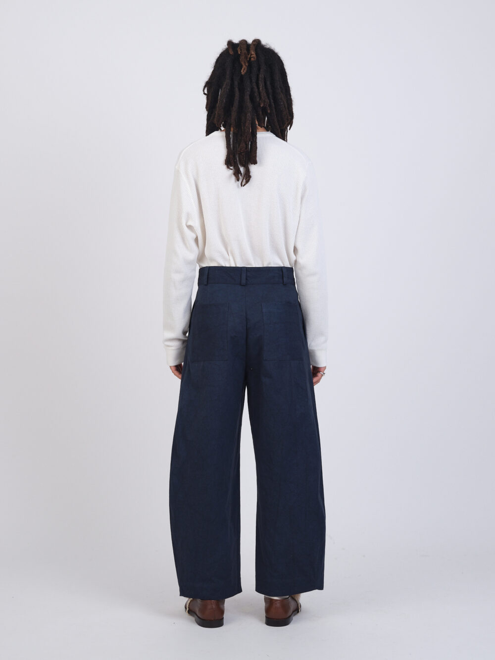 The Robby Trouser in a structured Japanese cotton twill. A balloon style leg, featuring front pleats, side pockets, back patch pockets, belt loops, and hidden button fly.