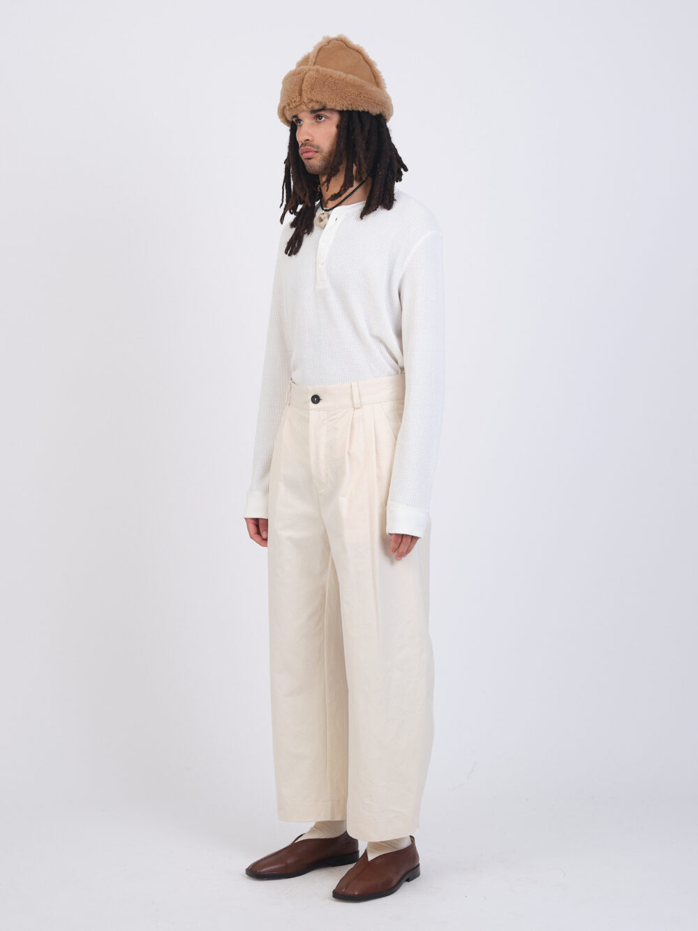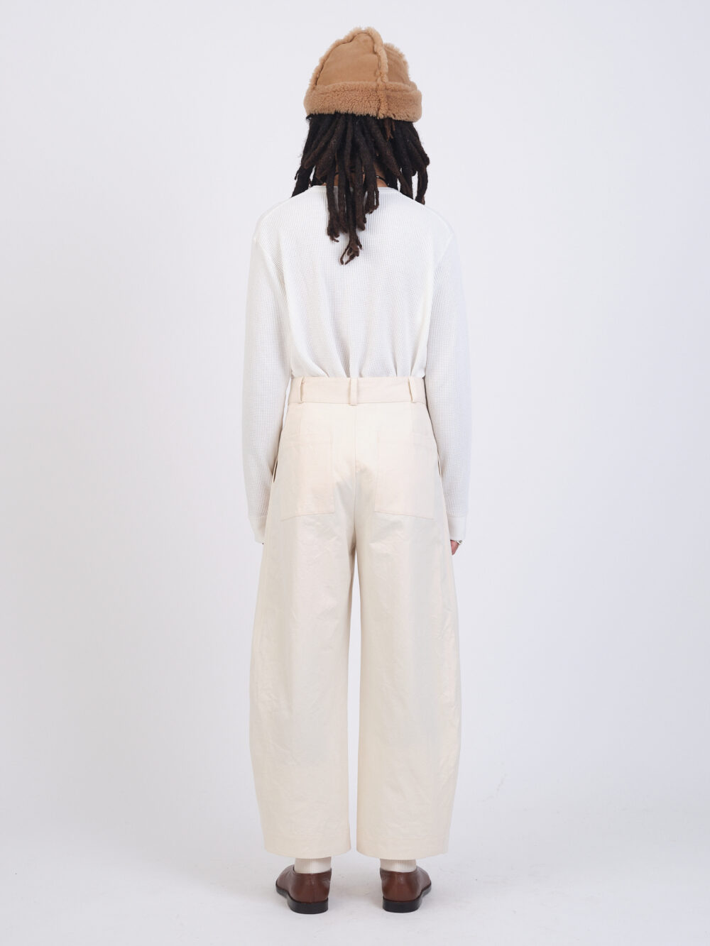 The Robby Trouser in a structured Japanese cotton twill. A balloon style leg, featuring front pleats, side pockets, back patch pockets, belt loops, and hidden button fly.