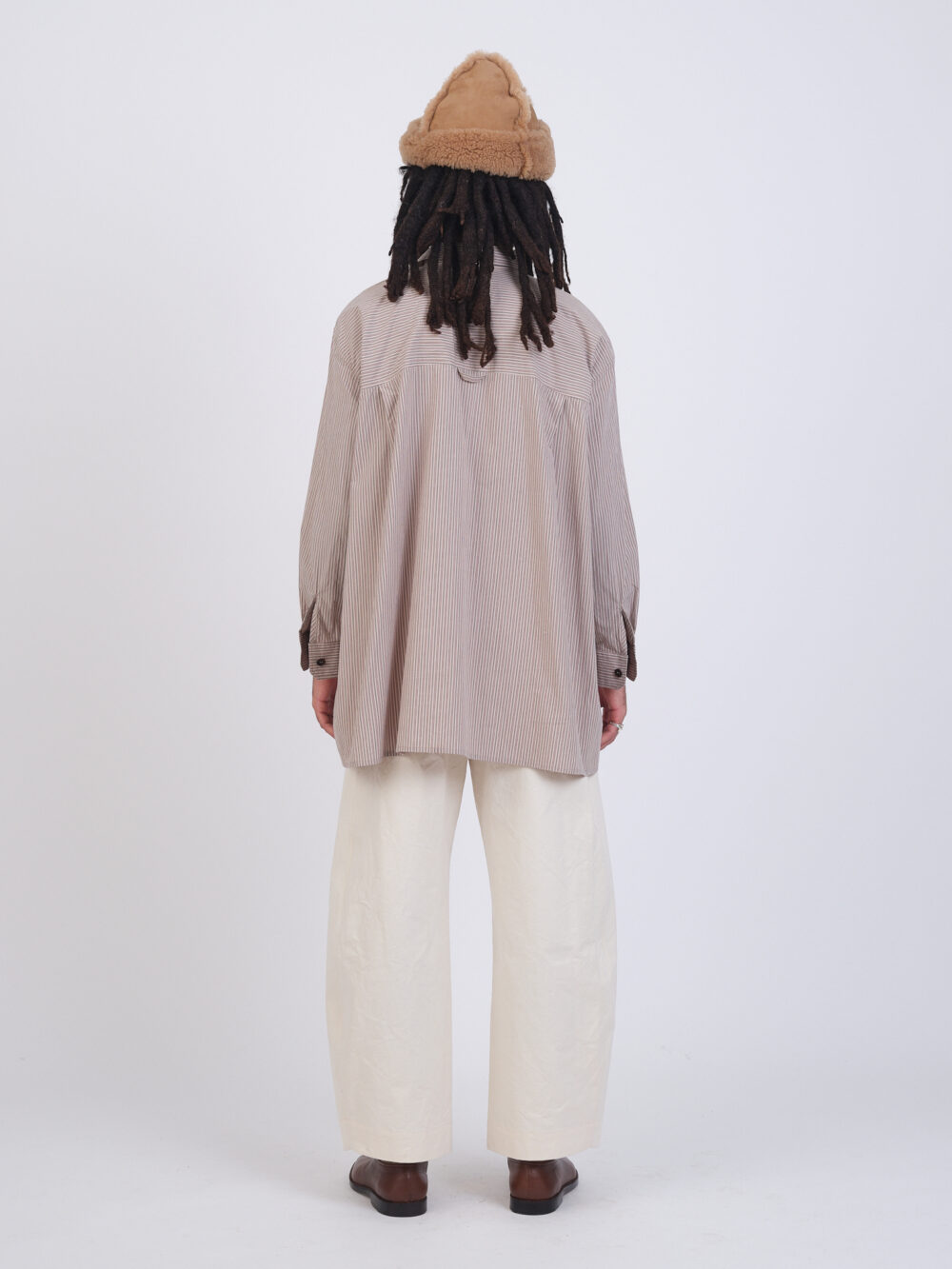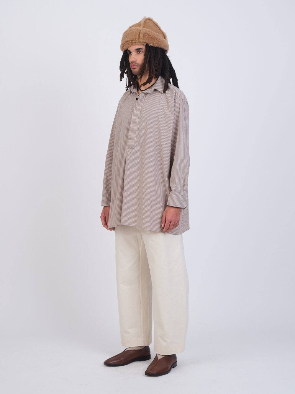 A pullover men’s shirt, the Half Placket Shirt is a slightly oversized style featuring a half placket hidden button closure.