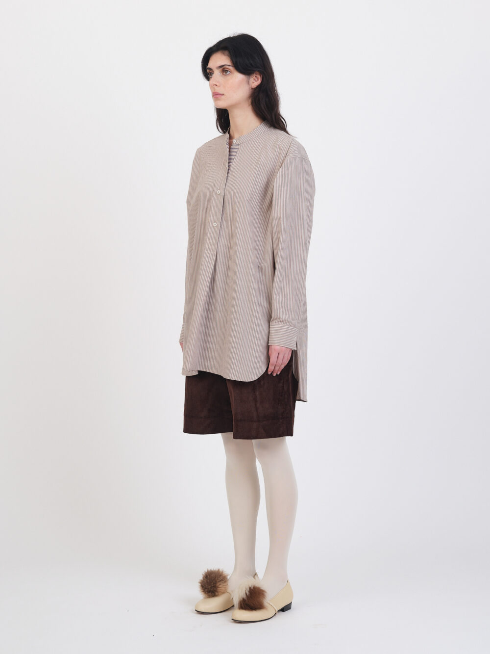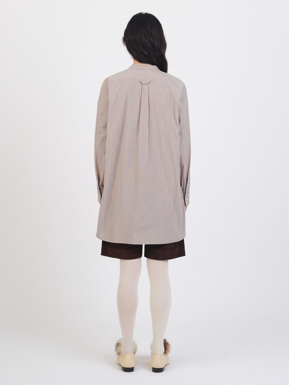 The Ines Shirt has been with us since our first collection. Featuring a grandad collar, half front placket opening with pleat, back yoke with a box pleat, cuffs with a button closure, and a high-low hem. In a Japanese crisp shirting with a contrast stripe on the inner placket.