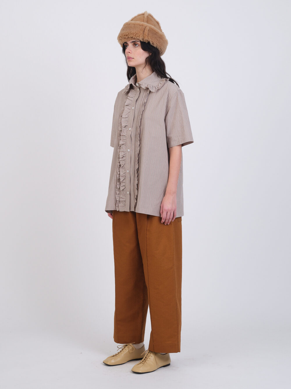 The Dallas Shirt features ruffles up the front button closure and on the collar and a back yoke.