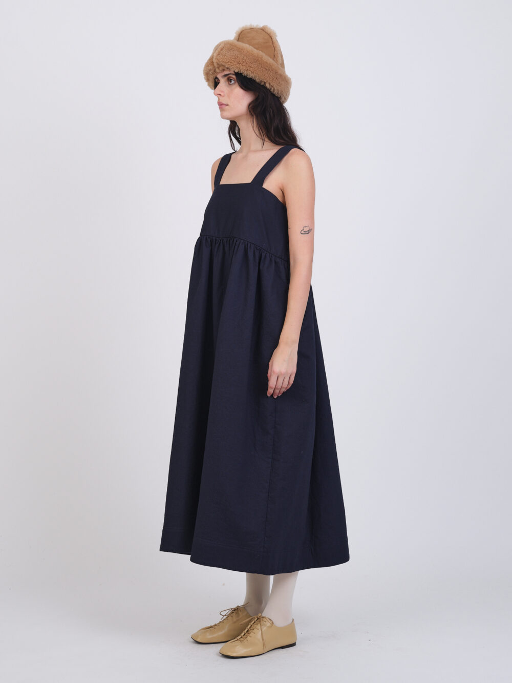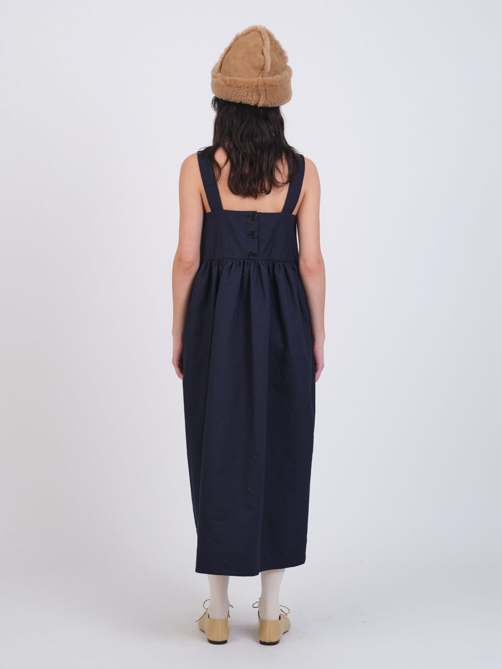 One of our oldest styles, the Elba Dress features a gathered empire waist, wide straps, and a button closure at the back. Also featuring side seam pockets.