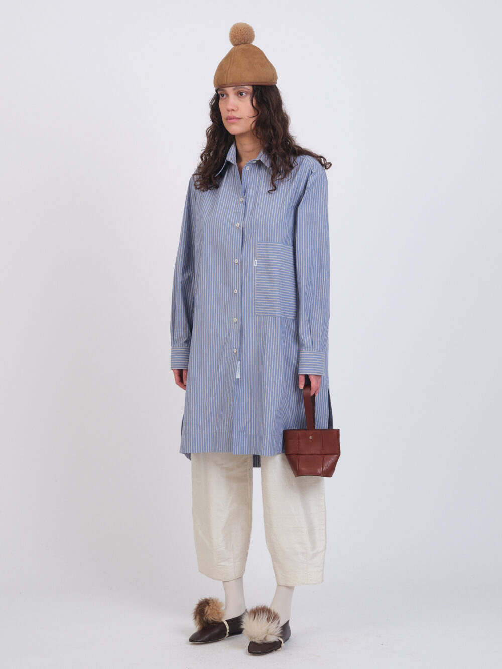 The Big Shirt is a classic, oversized button down featuring a contrasting stripe patch pocket on the left lapel and a high-low hem.