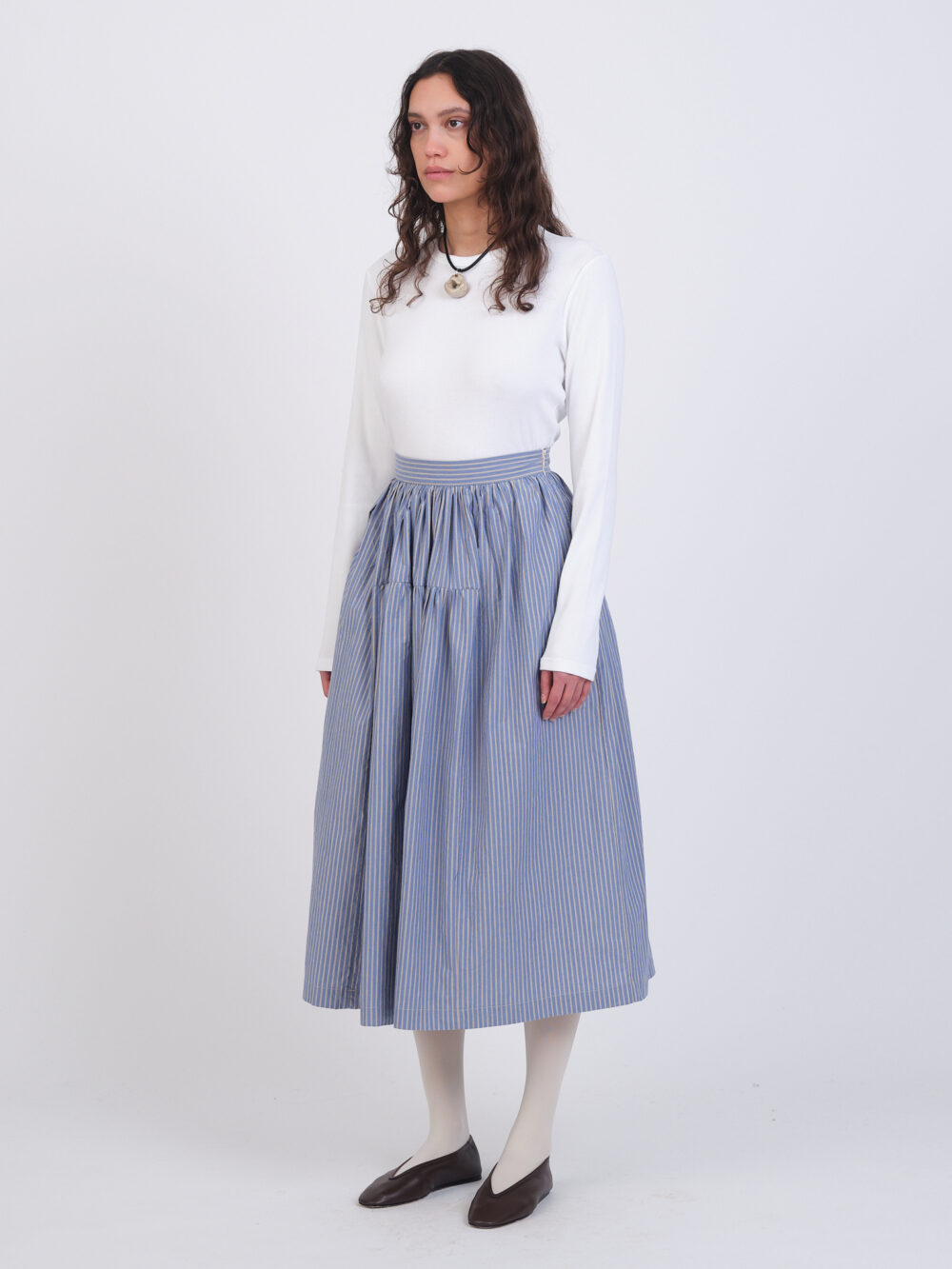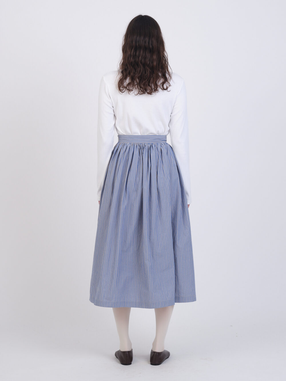 The Pannel Skirt is a mid-length style with a gathered waist band, gathered front panel, side seam pockets, and a concealed side zip.