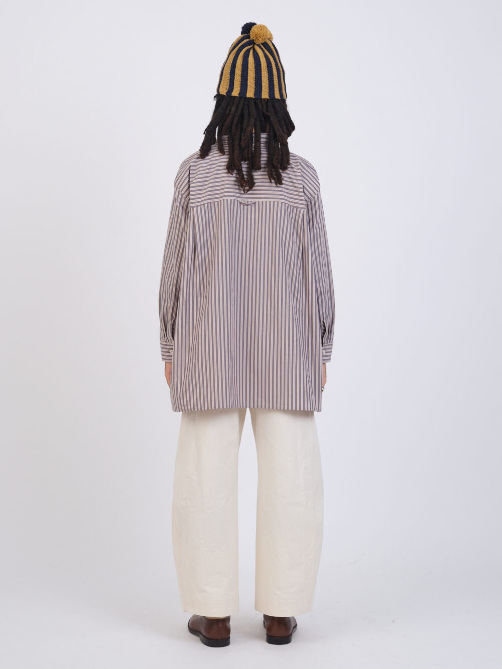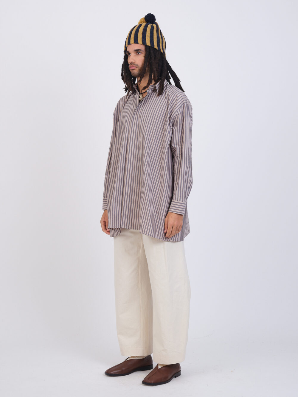 The Concealed Placket shirt in a crisp Japanese cotton. A slightly oversized shape, featuring a concealed button placket, button closure, and contrasting stripe cuff.