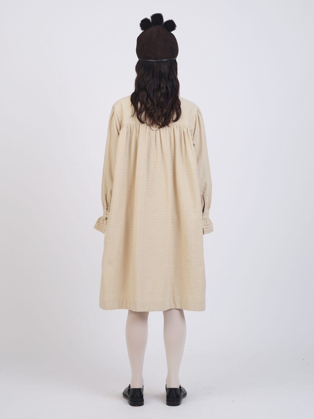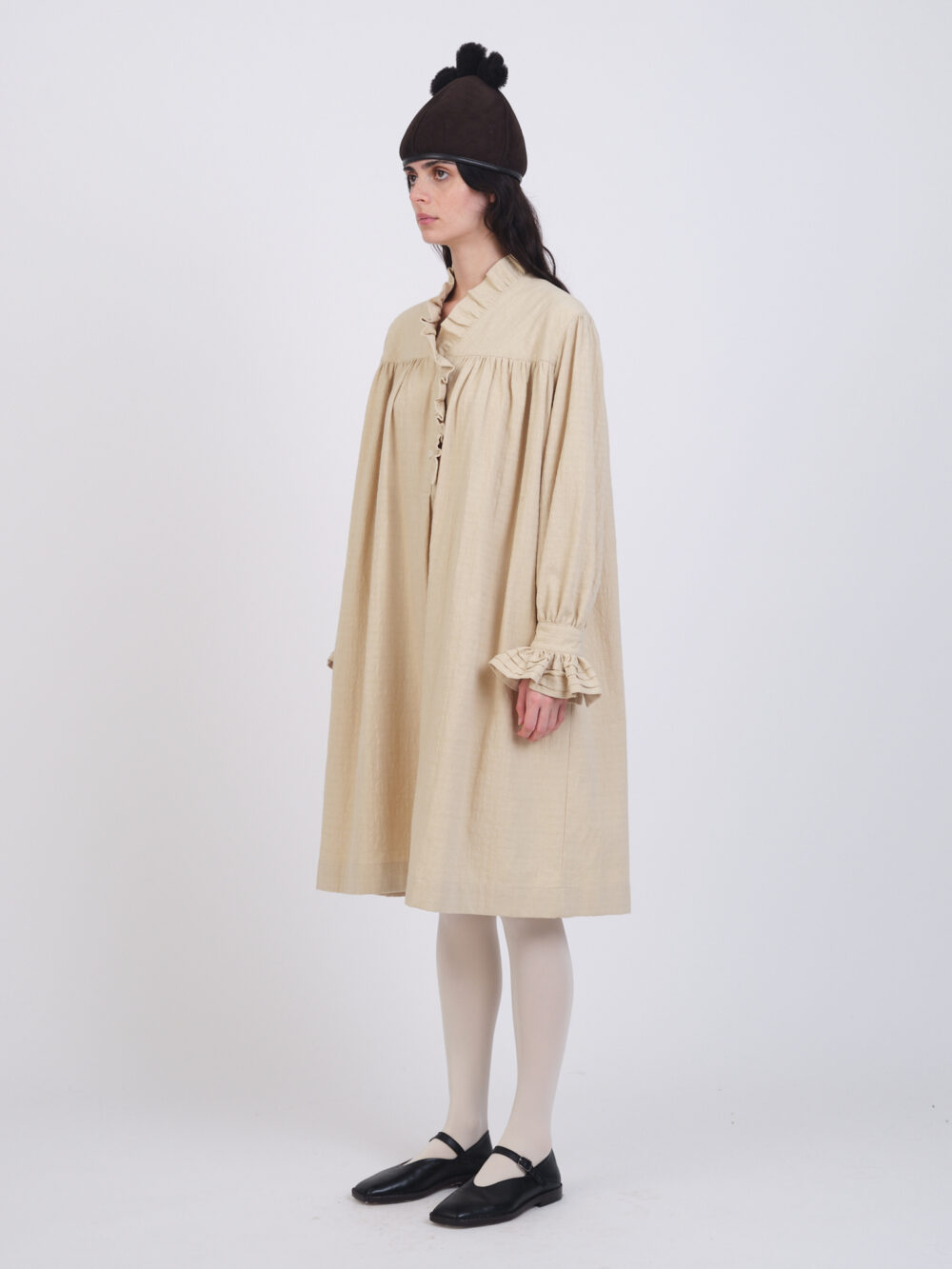 Our classic Olive Dress in Japanese textured cotton features a gathered yoke with a ruffled collar and button closure. Also featuring side seam pockets and pleated cuffs with button and loop closures.