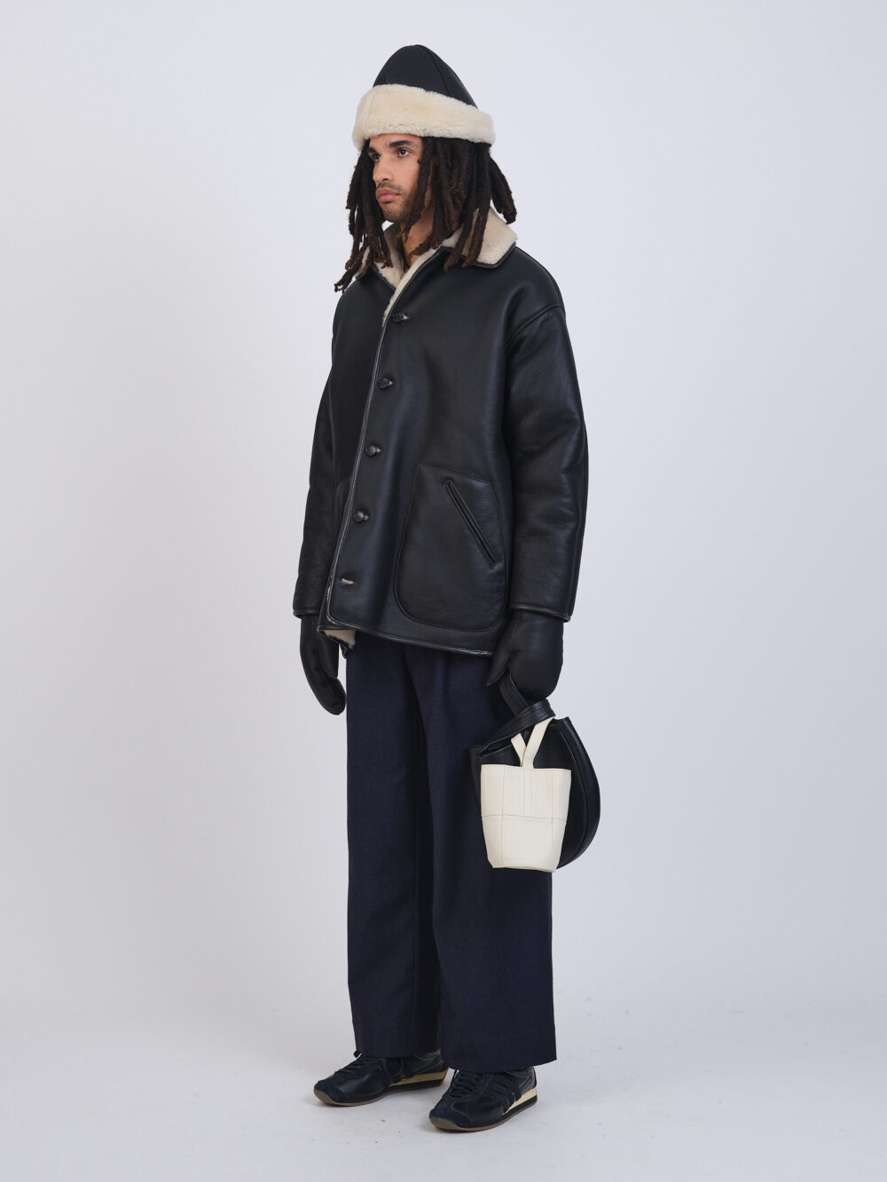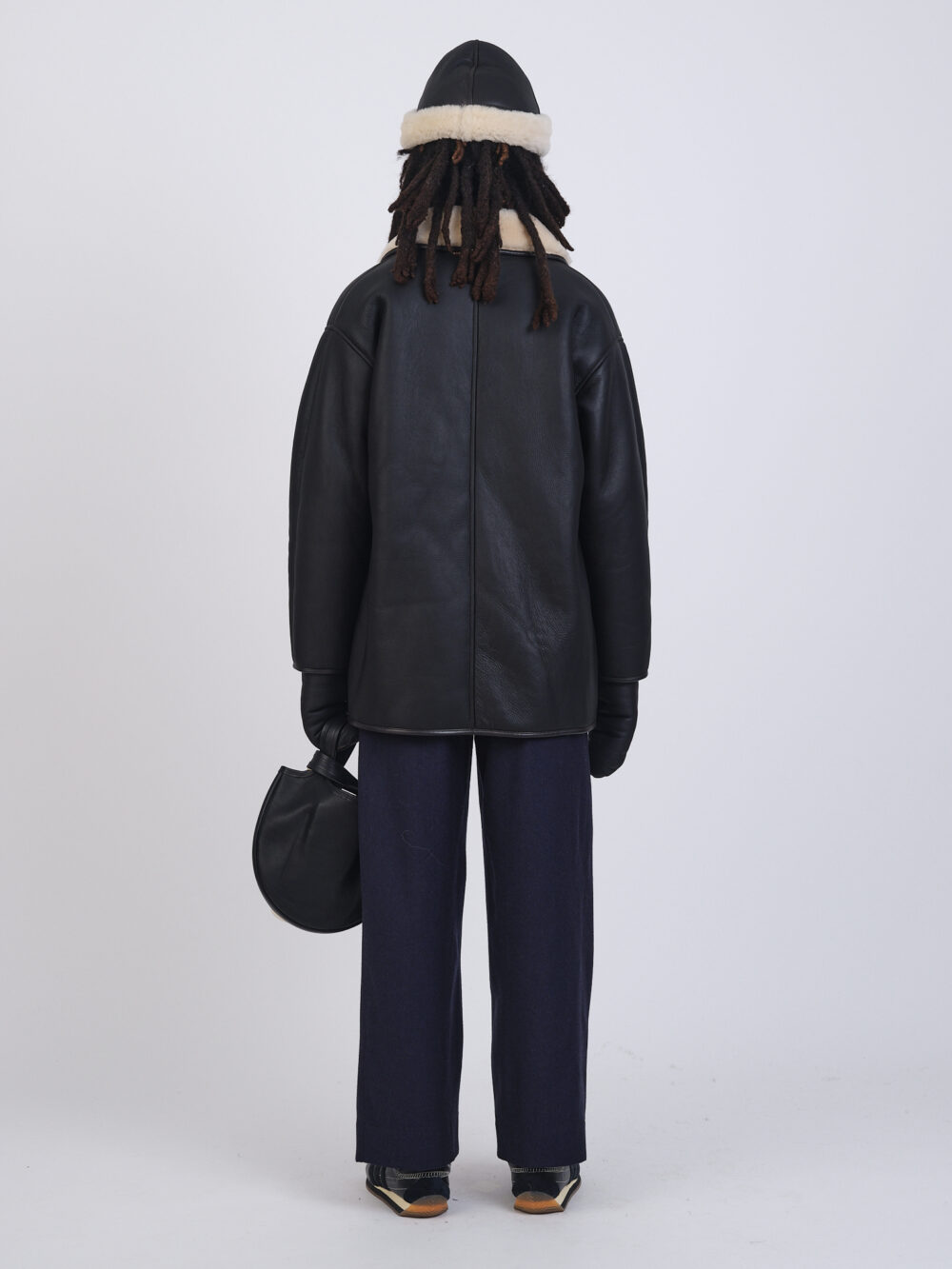 The Ronny Jacket with a leather back and straight hair sheepskin interior. Featuring a fur collar, patch pockets with welt opening, leather nappa binding, and horn buttons.
