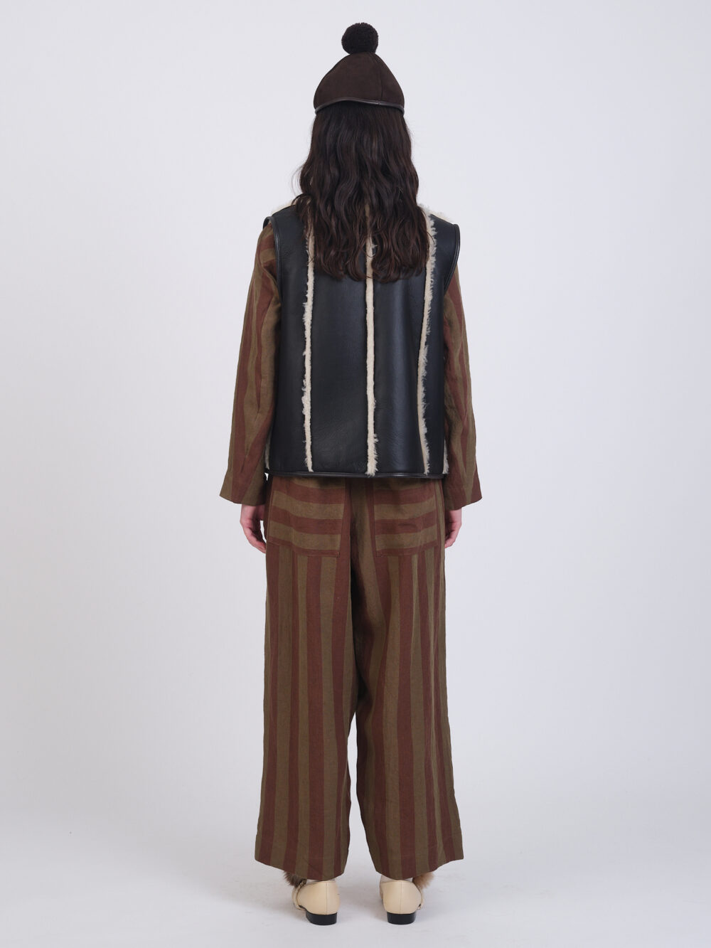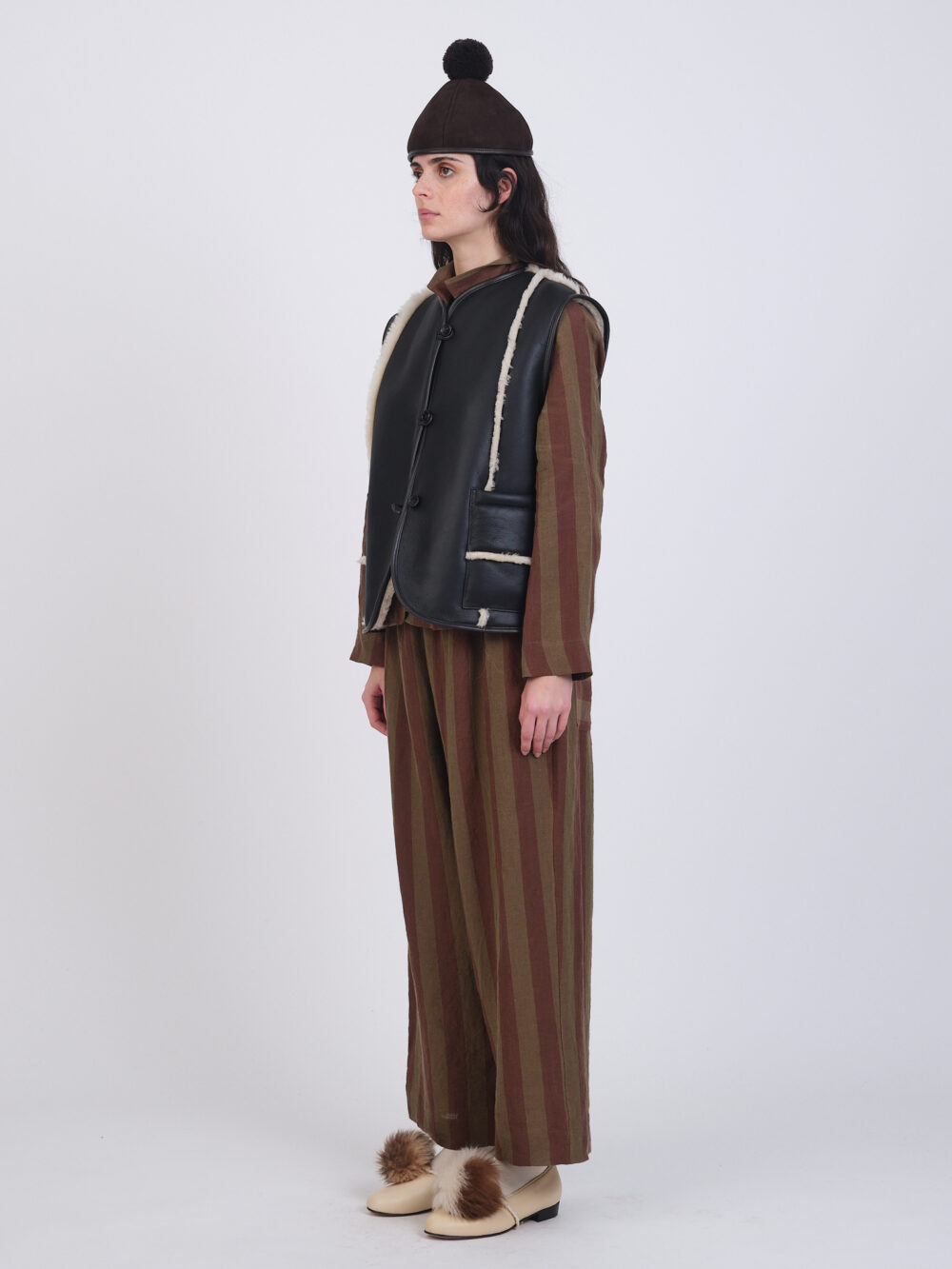 The Ella Vest in a reversible striped leather back with straight hair interior. Featuring patch pockets with contrasting stripe, leather nappa binding, and button closure.