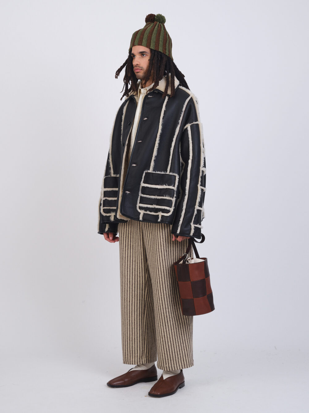 Our classic a-line Avis Jacket for men, a customer favourite, in a reversible leather back with straight hair interior and stripe with exposed seams. Featuring a fur collar, patch pockets with contrasting stripe, leather nappa binding, and button closure.