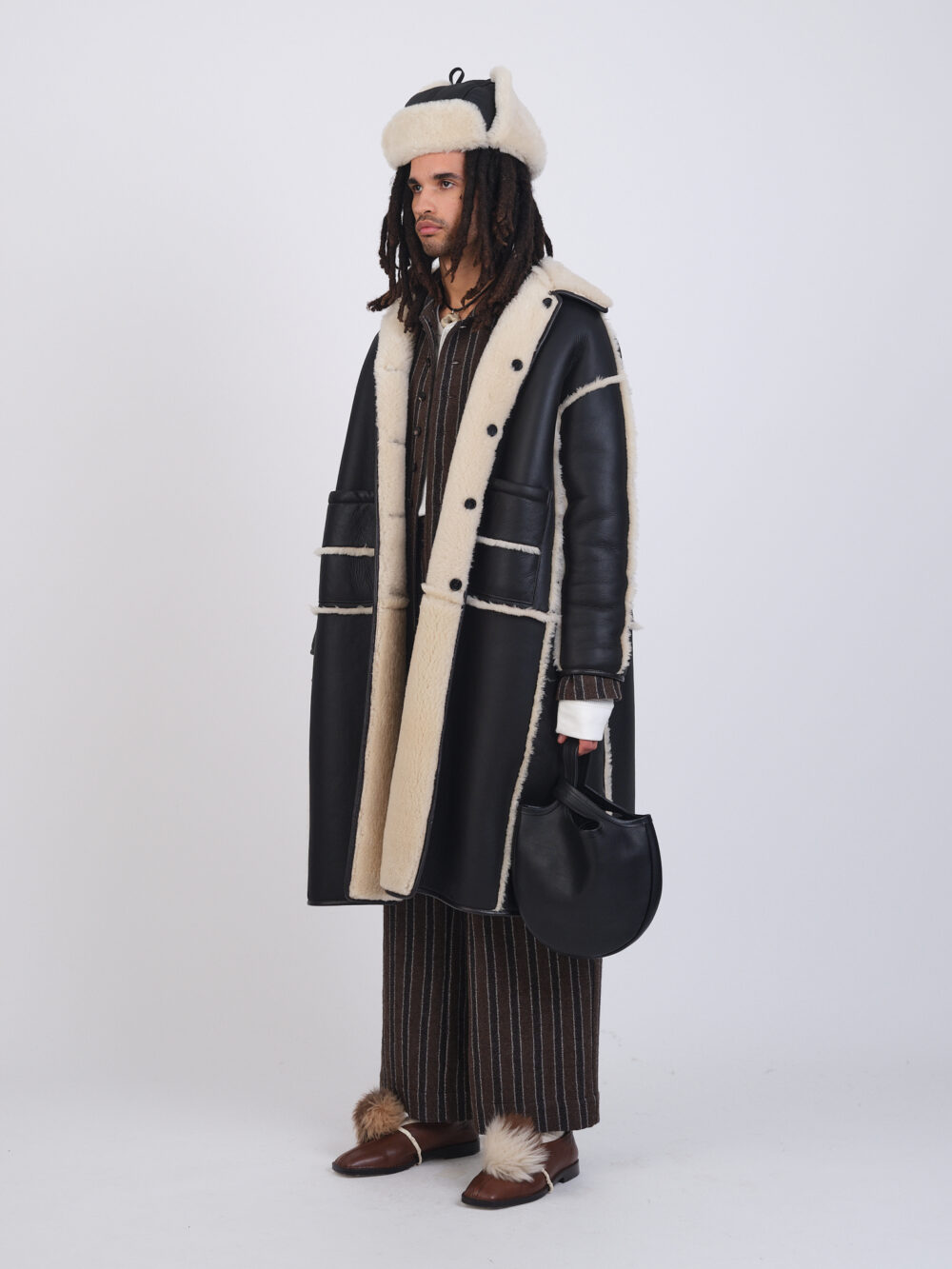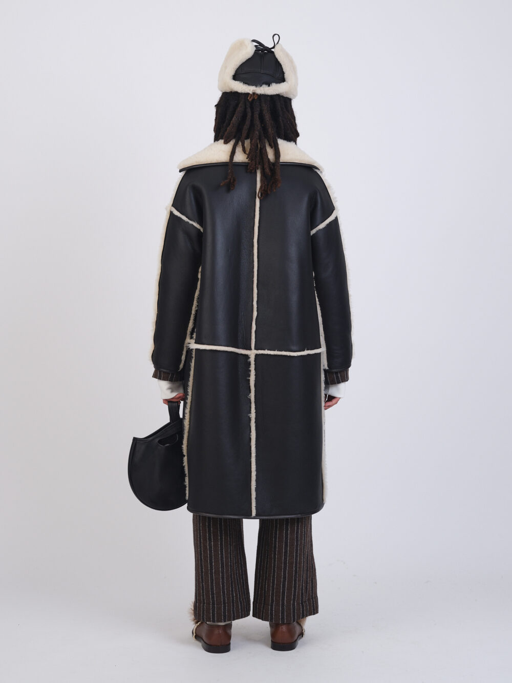 Our classic Avis in a longer style, with a reversible leather back with straight hair interior. Featuring exposed seams, a fur collar, striped patch pockets, leather nappa binding, and button closure.