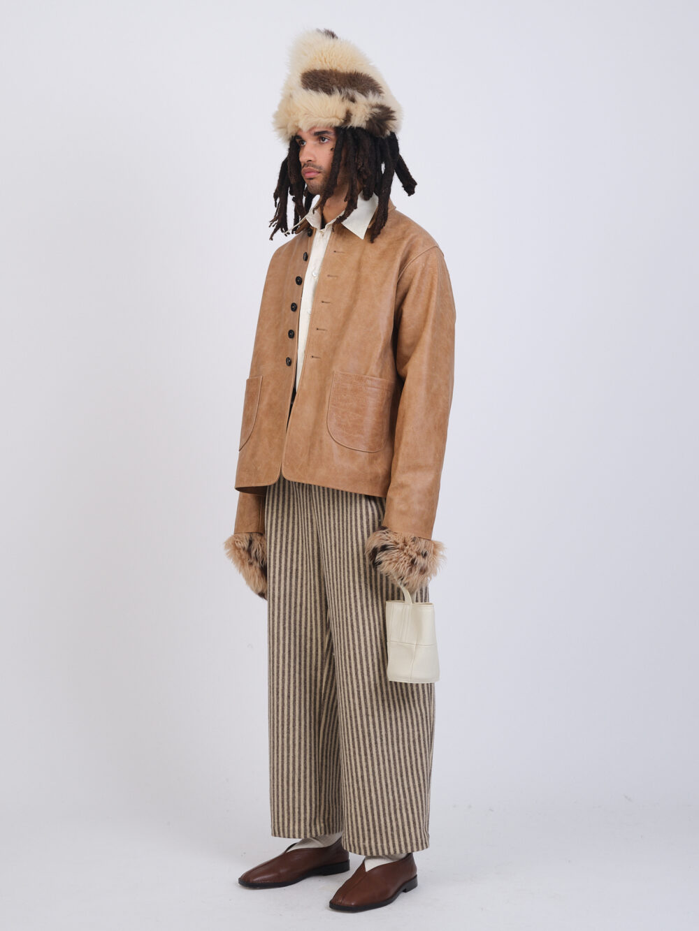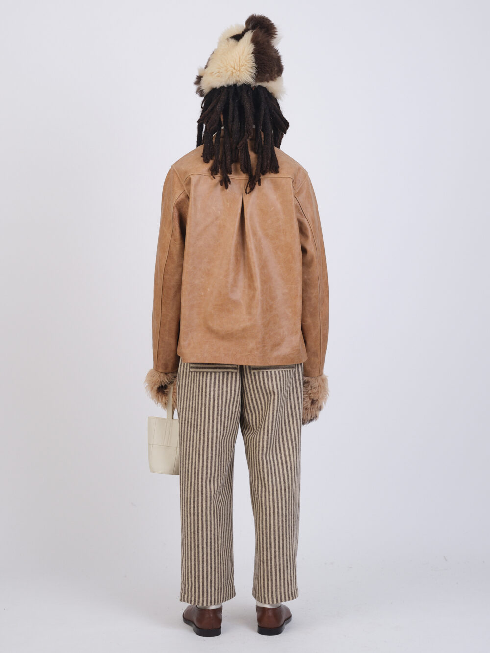 The Sandy Jacket in a suede-line, buttery leather. Featuring two front patch pockets and a buttton closure.