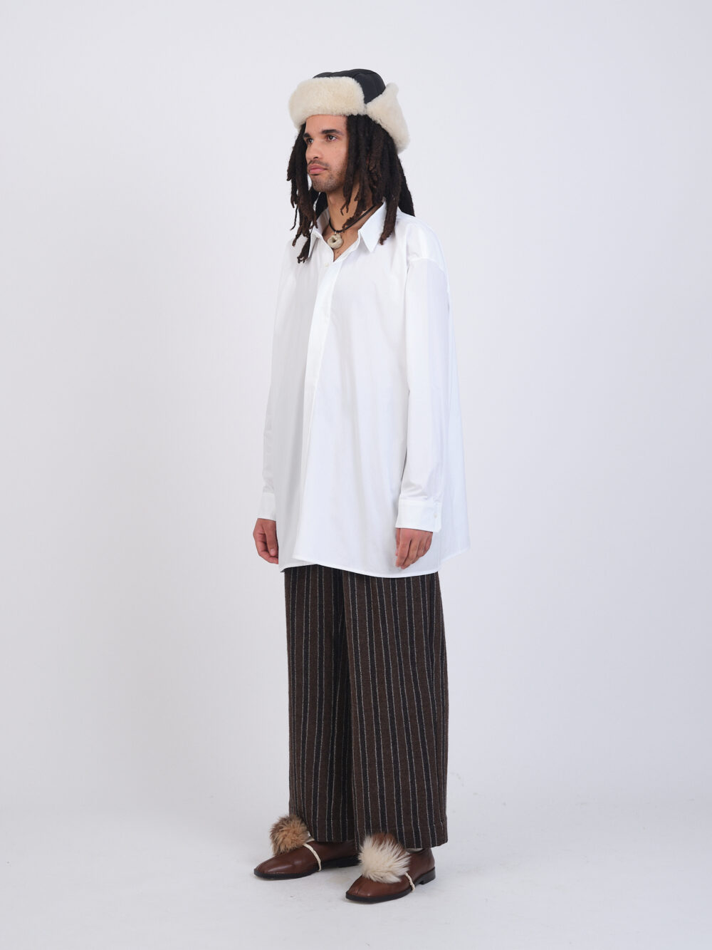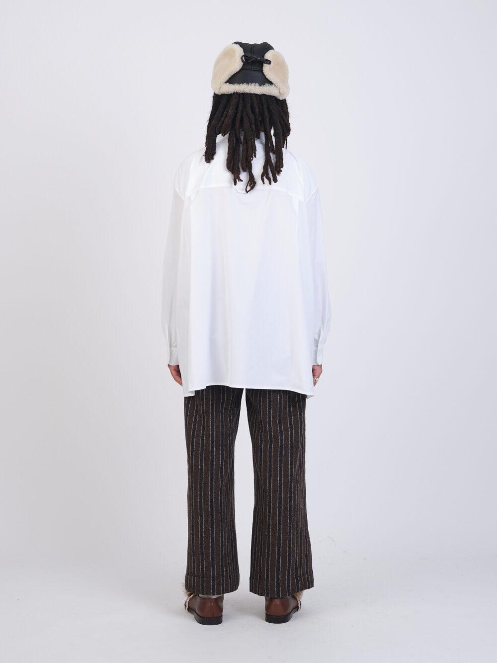The Concealed Placket shirt in a crisp Portuguese cotton poplin. A slightly oversized shape, featuring a concealed button placket and button closure.