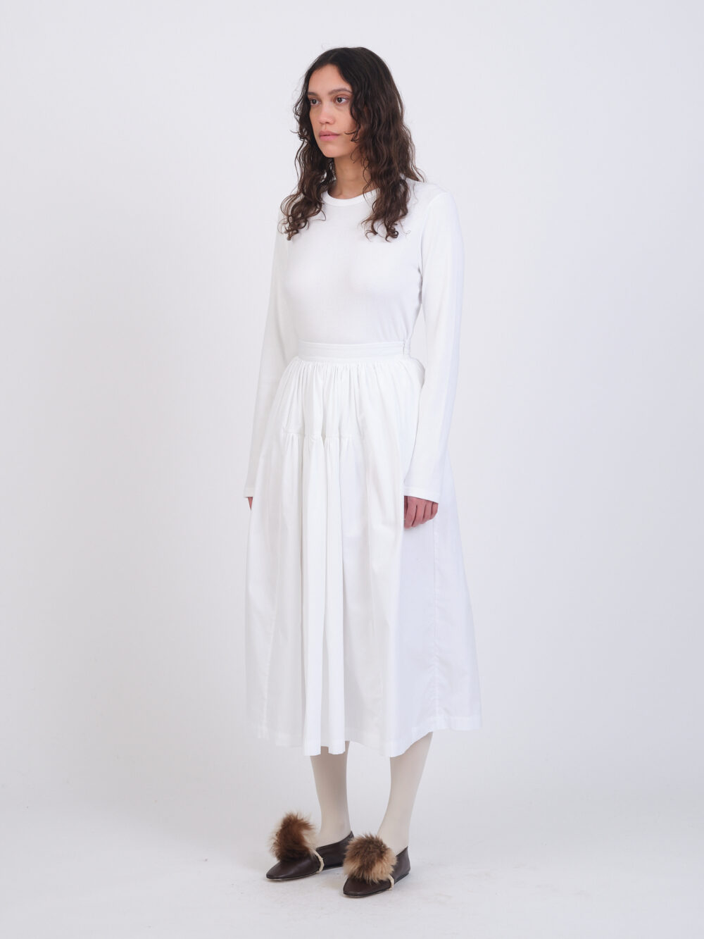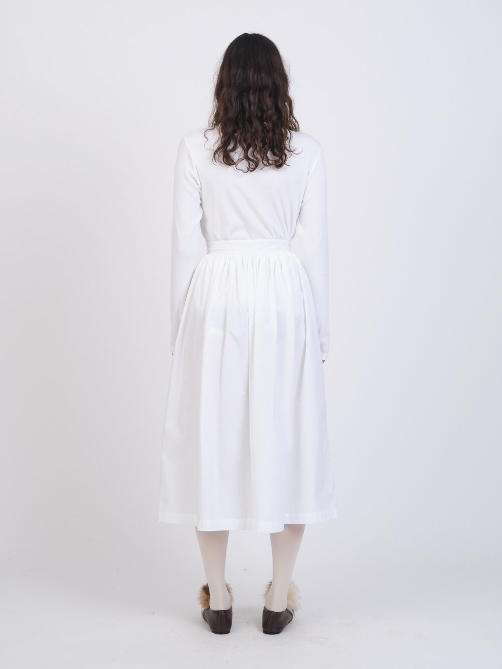 The Pannel Skirt is a mid-length style with a gathered waist band, gathered front panel, side seam pockets, and a concealed side zip.