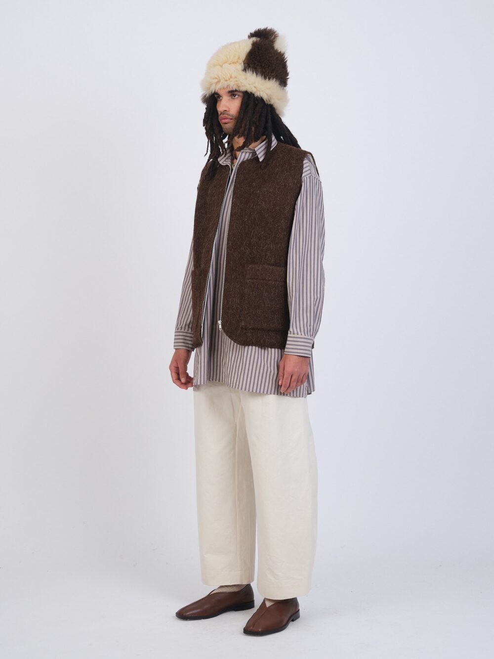 Our classic men’s River Vest, in Portuguese long hair wool with a zip closure. A boxy shape featuring front patch pockets.