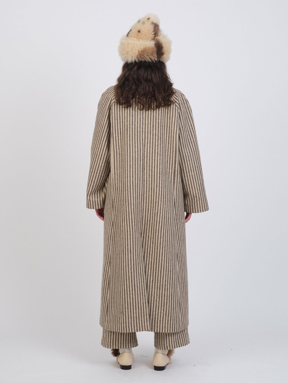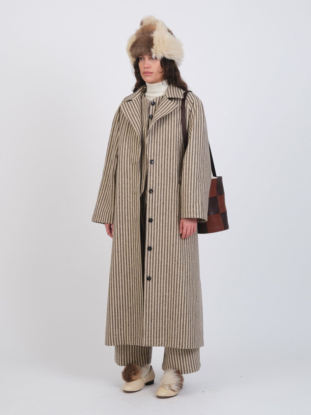 The Annie Coat is a long style featuring front welt pockets and a vented back. There is a button under the collar and on the lapel for easy fastening.