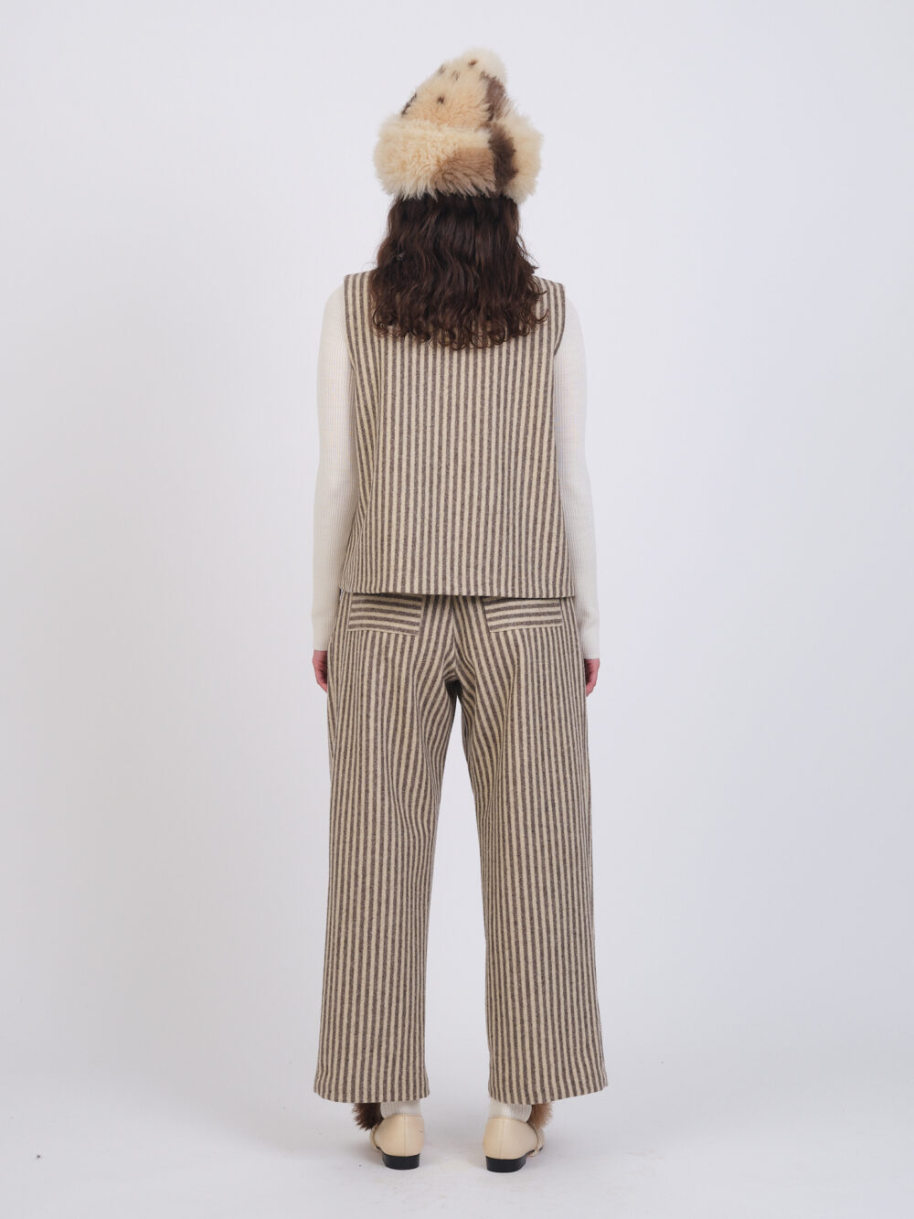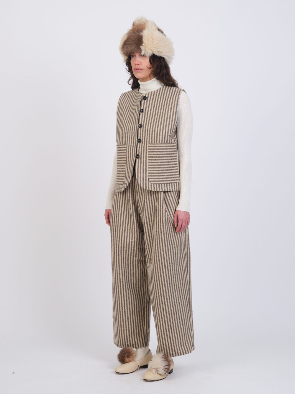 Our new Imogen Vest in Portuguese striped wool. Featuring two front patch pockets and button closure, perfect on its own or for pairing under the Andie Blazer or Annie Coat.