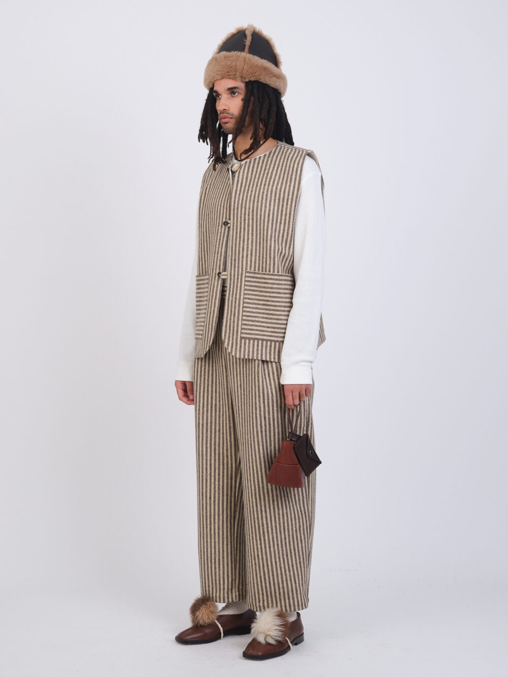 Our classic men’s River Vest, in Portuguese striped wool. A boxy shape, featuring front patch pockets with contrasting stripe, and button closure.
