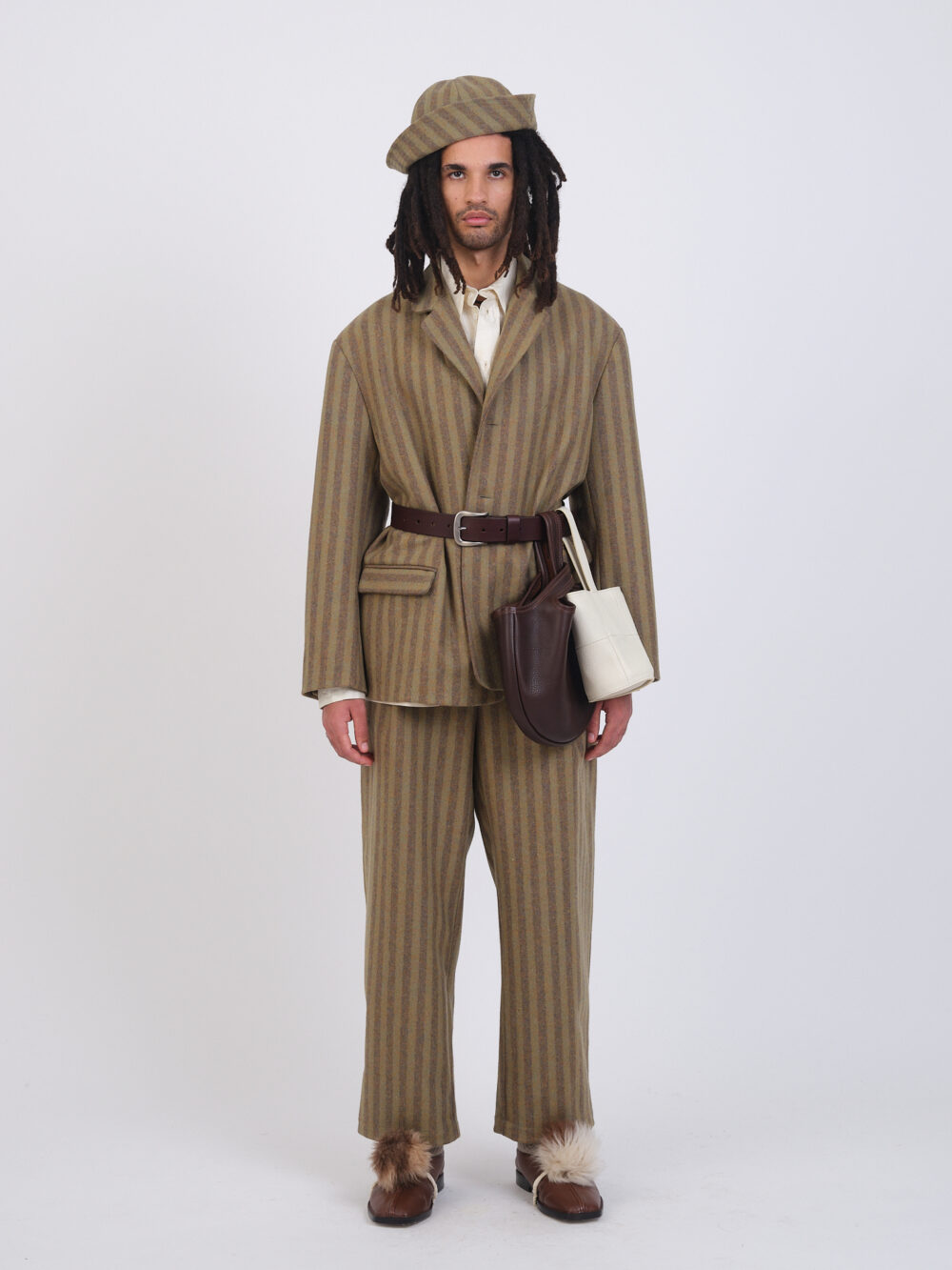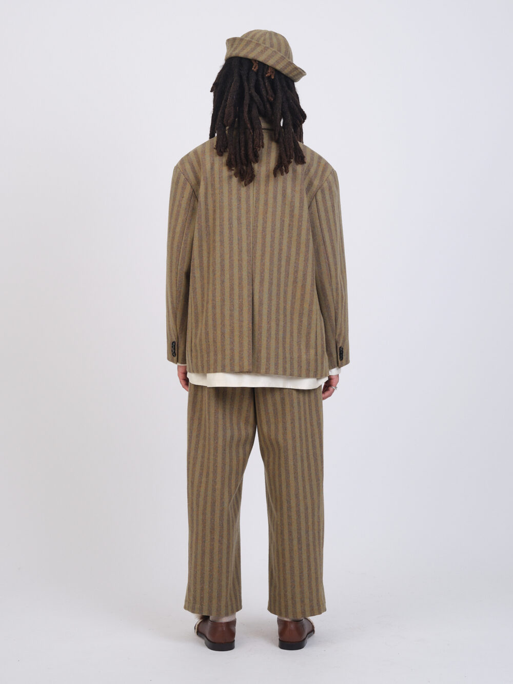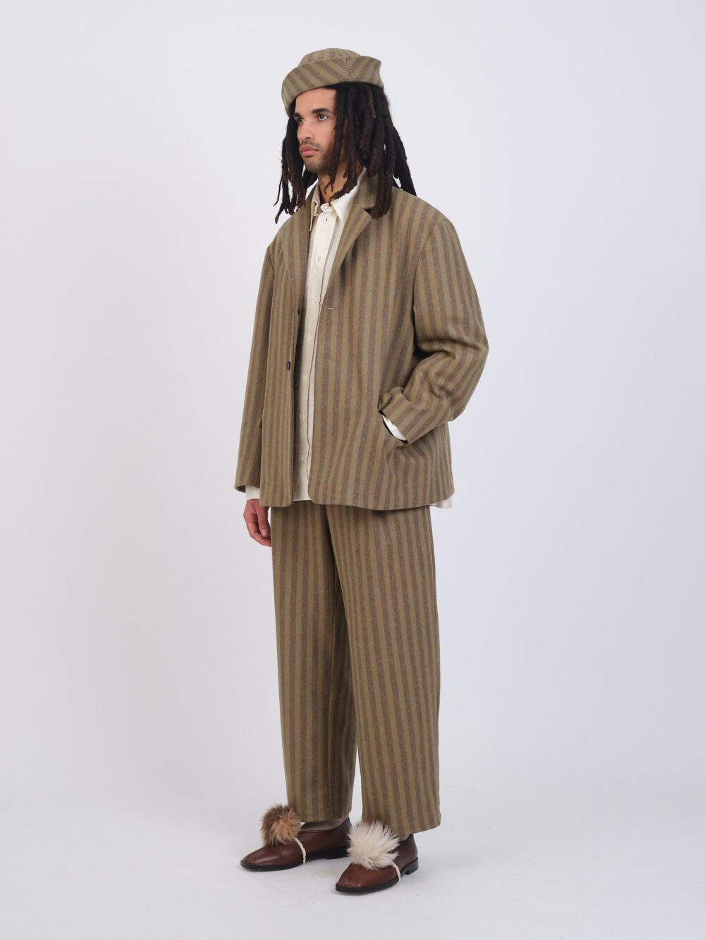 The Sid Blazer in a Portuguese striped wool. A slightly boxy fit with oversized shoulders, featuring two front flap pockets and a back vent.