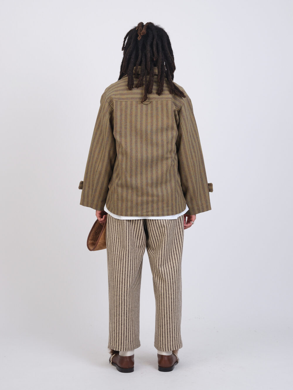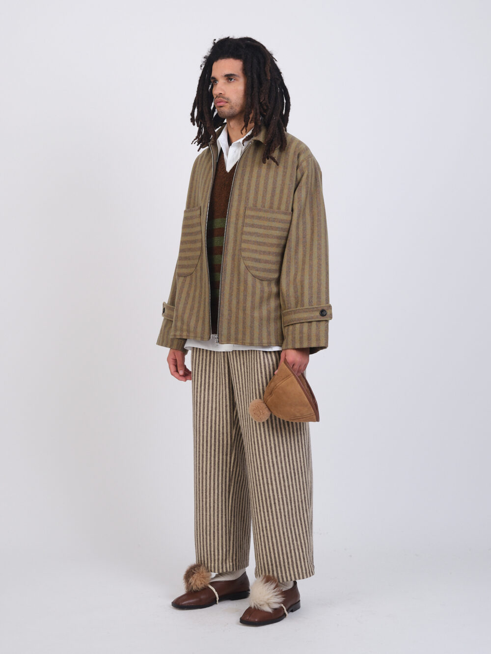 A new style for the season, the Aflie Jacket in Portuguese striped wool with a zip closure. Featuring two rounded front patch pockets in a contrasting stripe, and button tabs on the cuff.