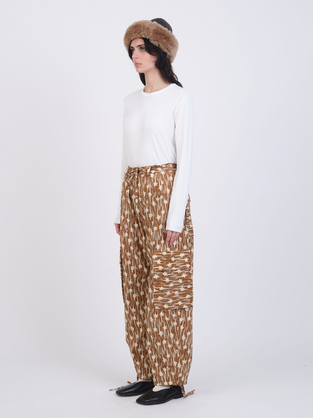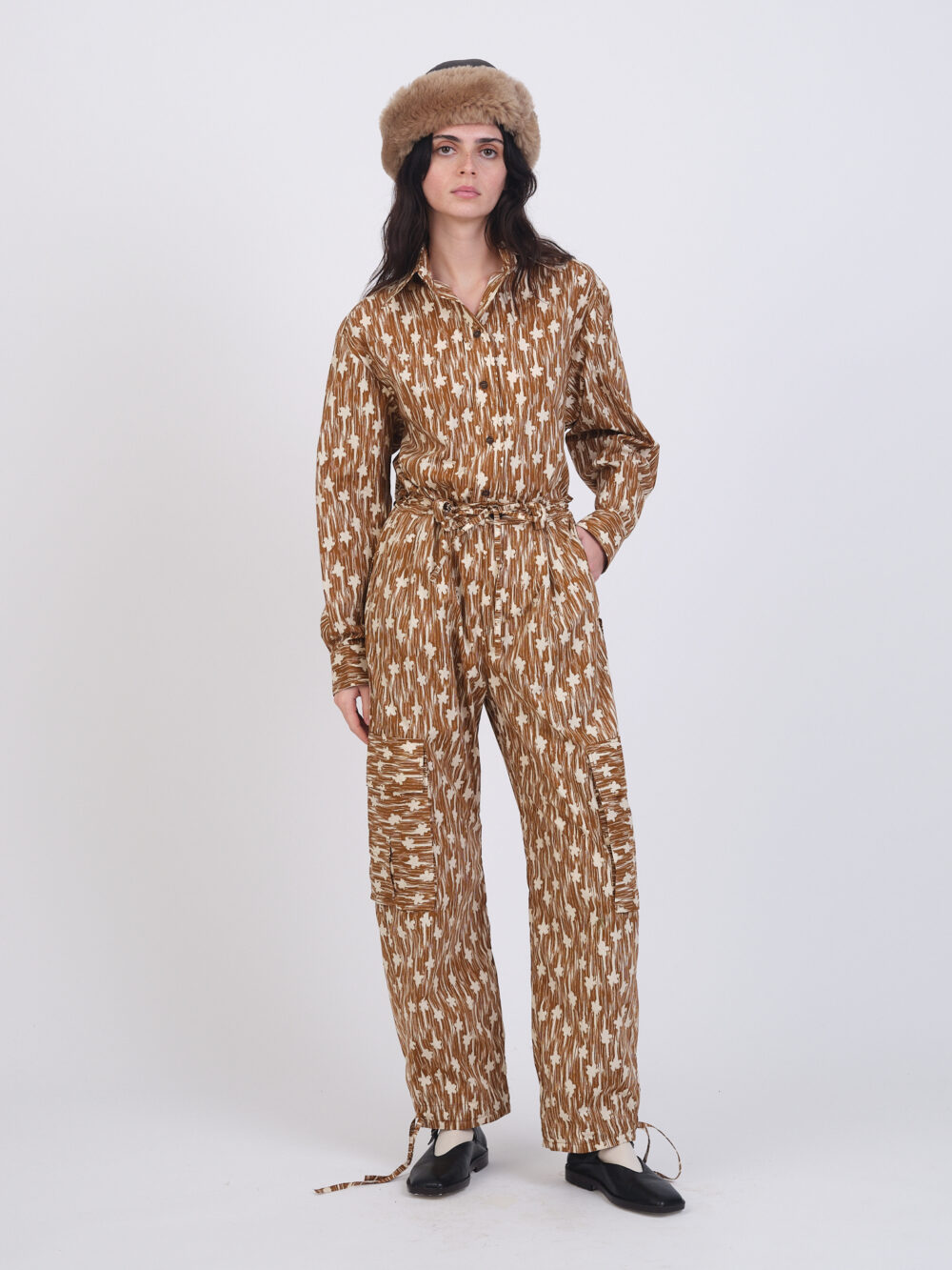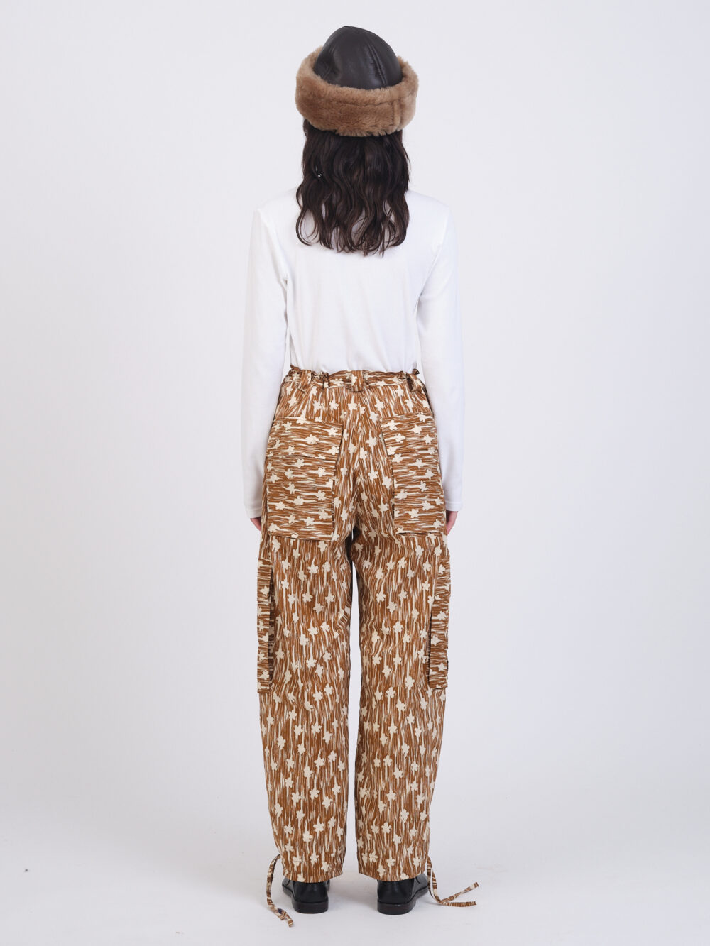 The Cargo Trouser in an exclusive Ikat flower printed cotton. Featuring cargo pockets on back and sides, drawstring waist and ankle ties, side seam pockets, belt loops, and button fly closure.