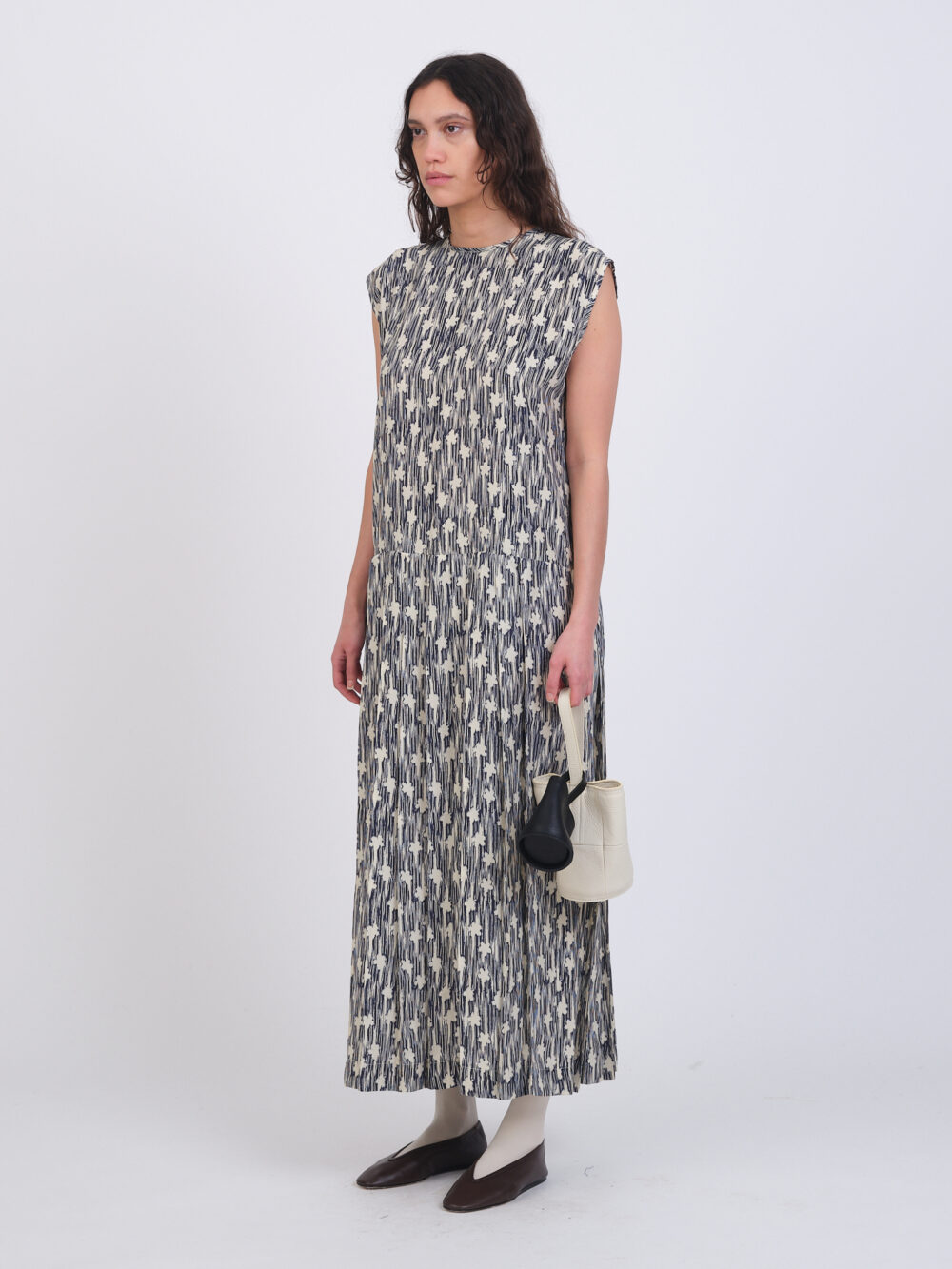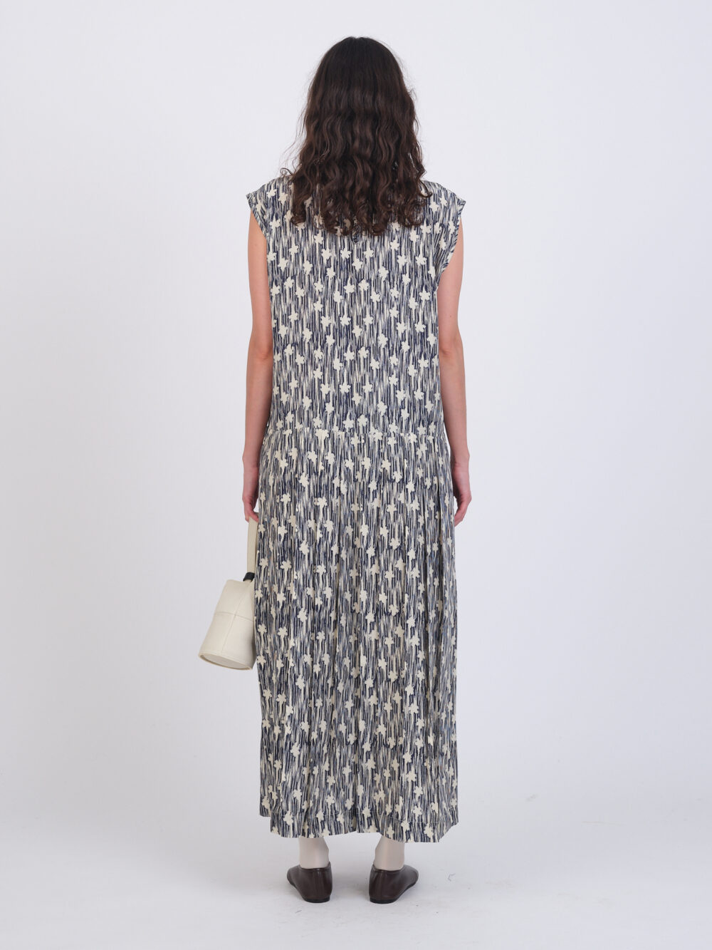 The Isabella Dress in an exclusive Ikat flower printed silk. A sleeveless style featuring a boxy top and dropped waist with skirt pleats, side seam pockets and a keyhole button closure.