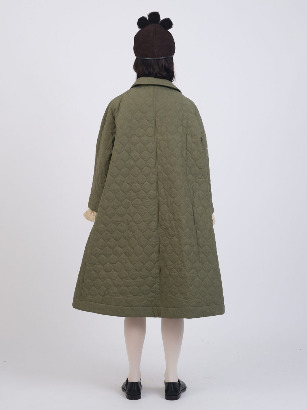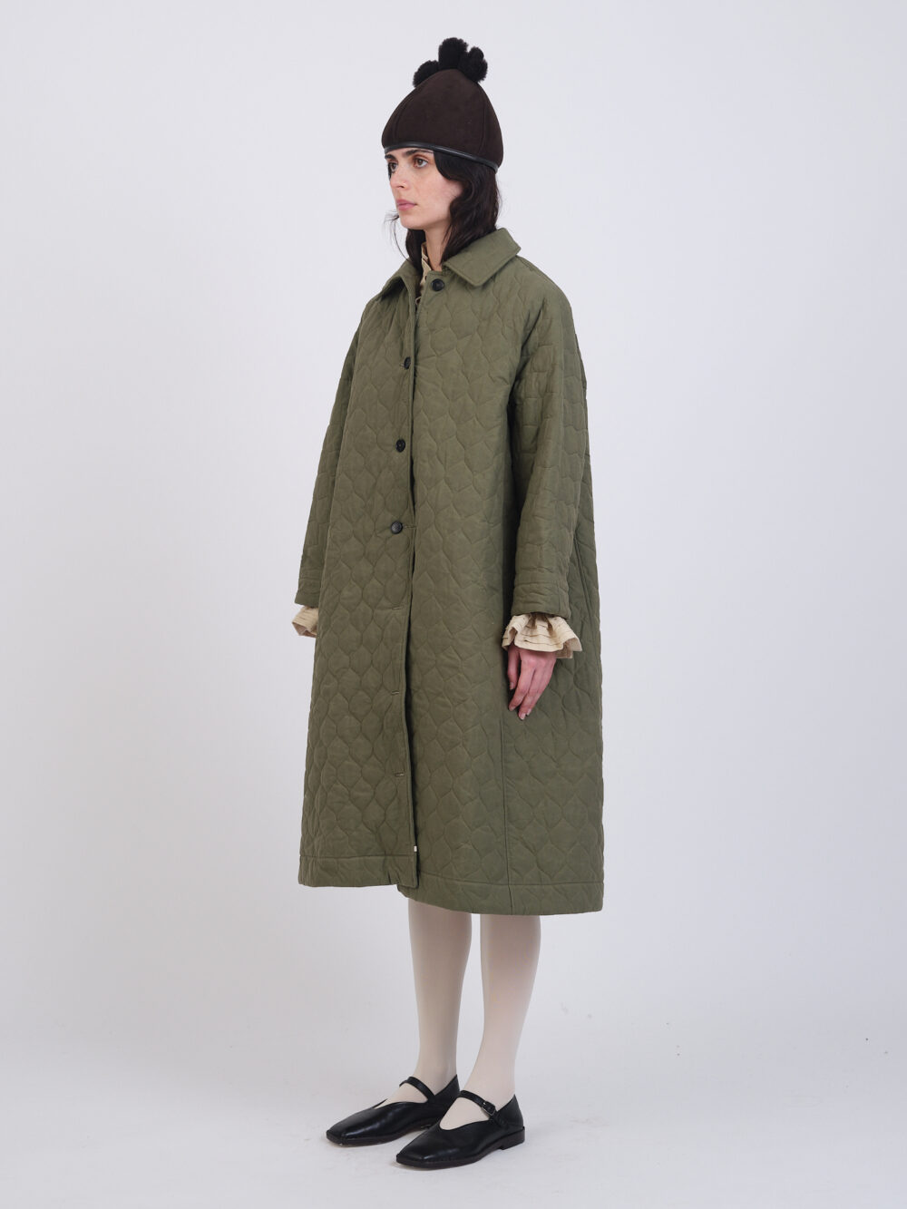 Our new a-line Roo Coat in a quilted British Dry Oilskin with side seam pockets.