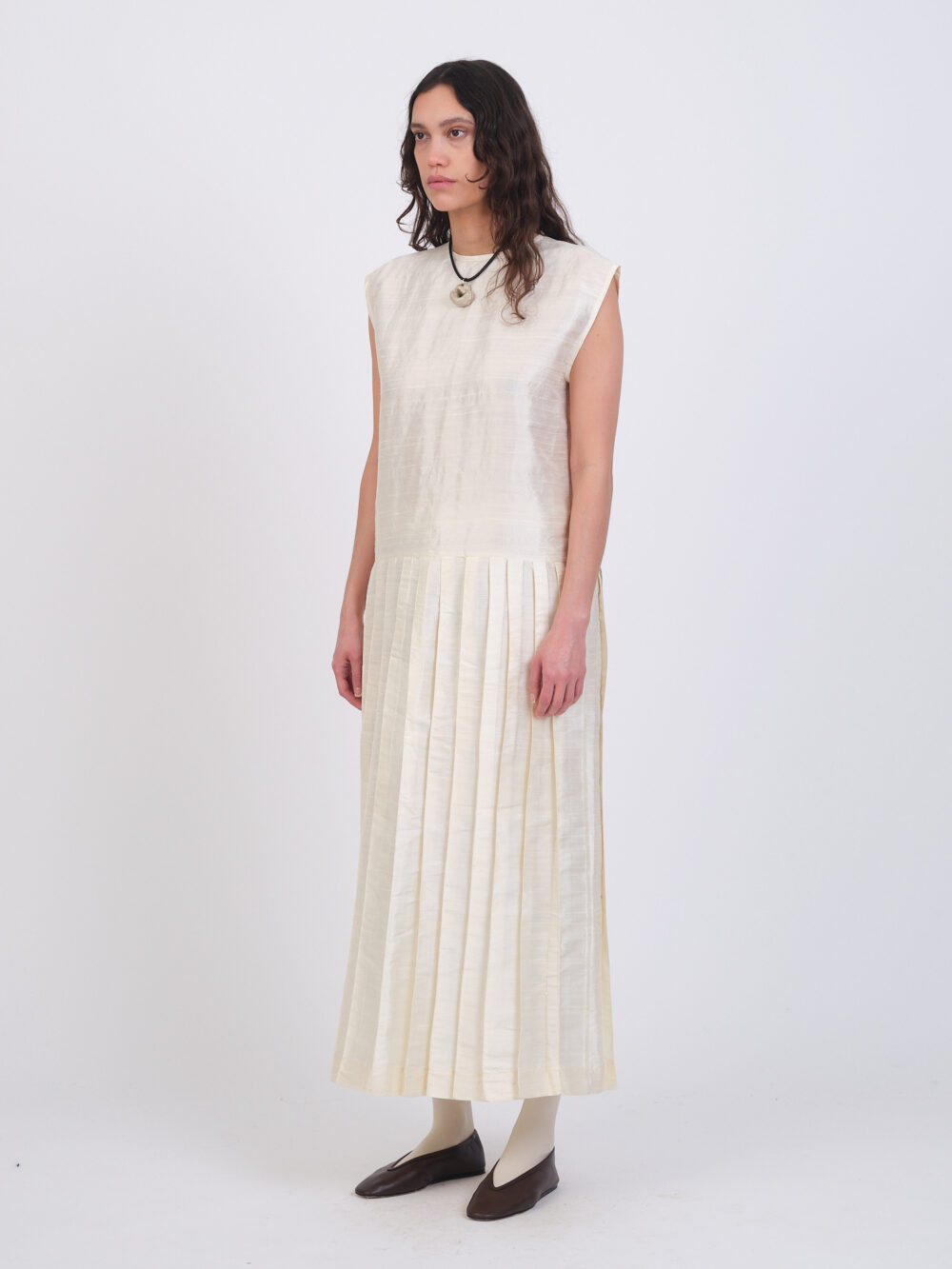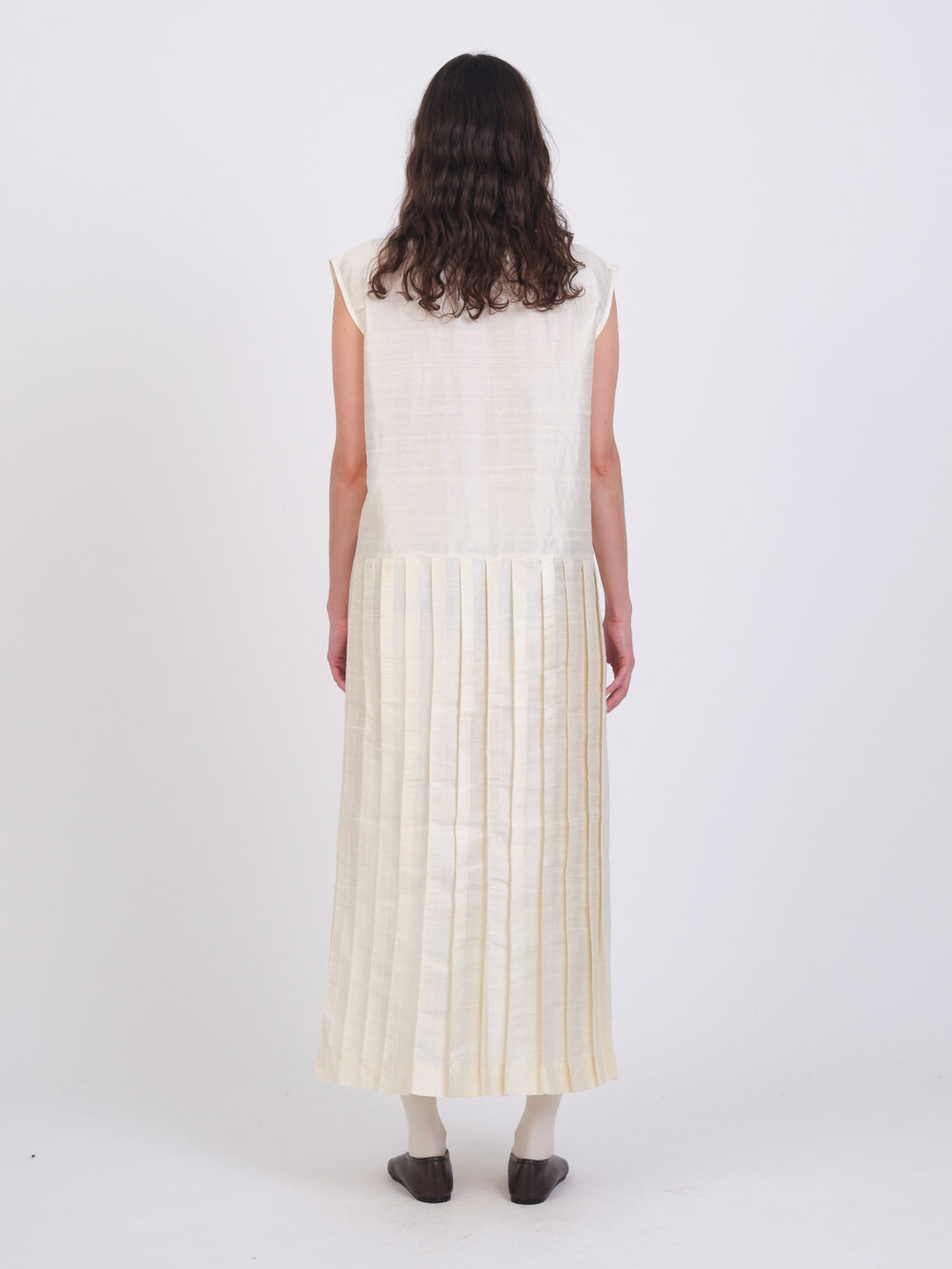 The Isabella Dress in an Indian slubbed silk dupion. A sleeveless style featuring a boxy top and dropped waist with skirt pleats, side seam pockets and a keyhole button closure.