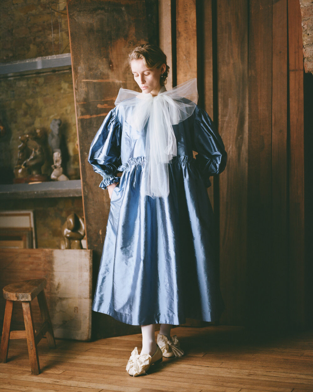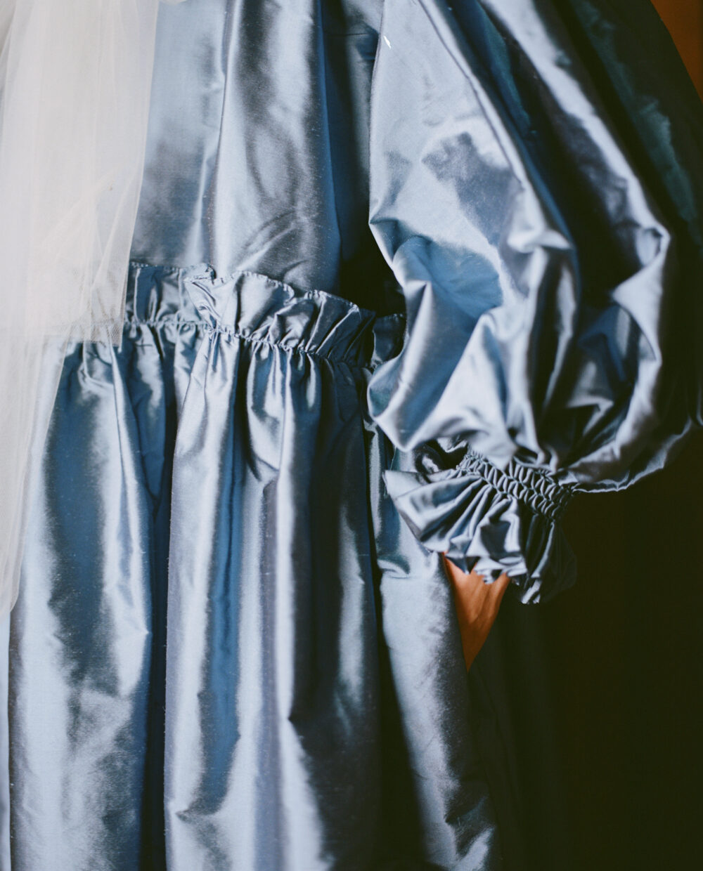 The Smocked Sleeve Dress is an oversized, over-the-head style dress with a gathered ruffle waistline and dropped shoulders. Featuring hand-gathered and hand-smocked cuffs, a Cawley signature. In a smooth silk dupion woven in India, the perfect something-blue for your wedding look.