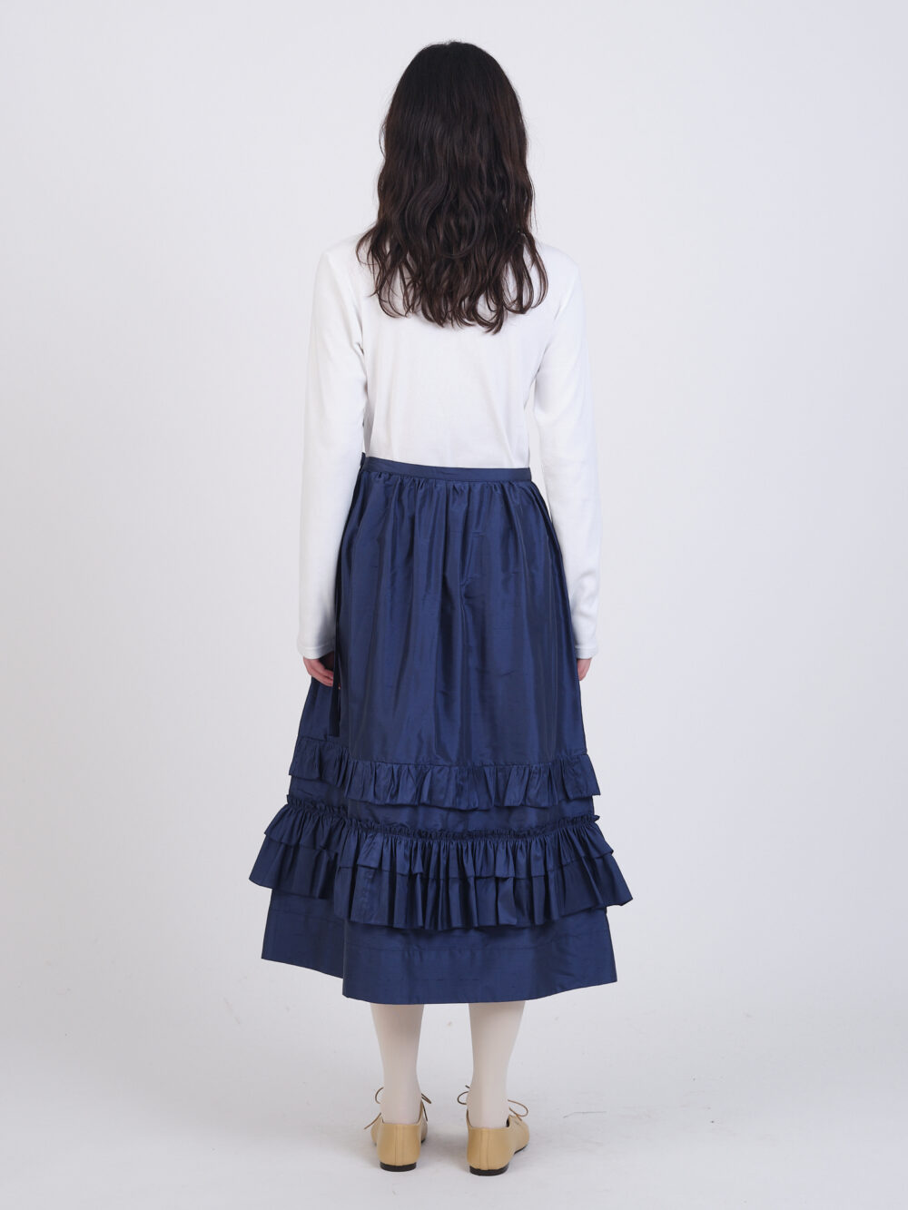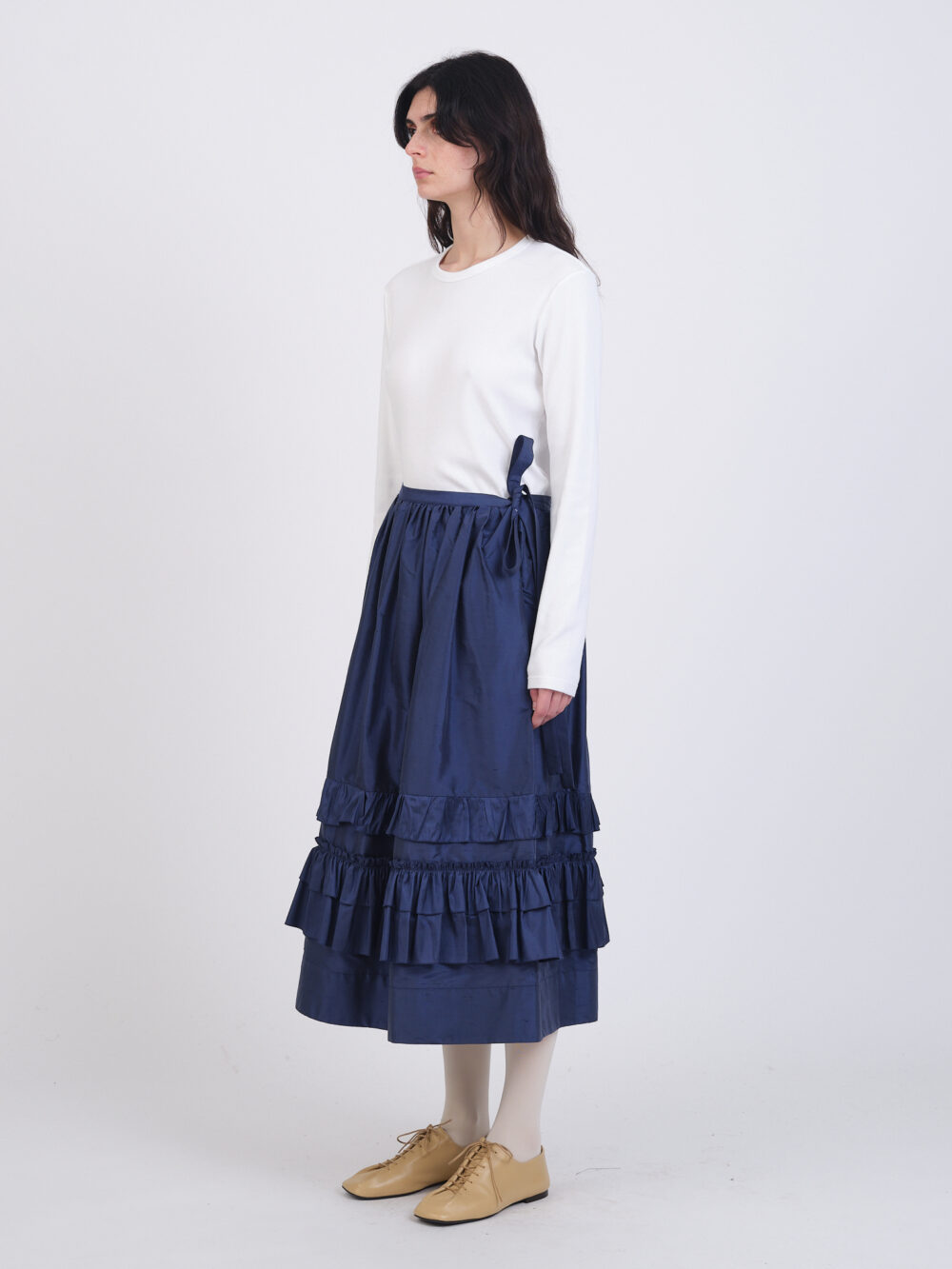 Our classic Betsy Skirt, a true customer favourite. The silk skirt features a side seam tie waist, side seam pockets, and hand-gathered hem frills.