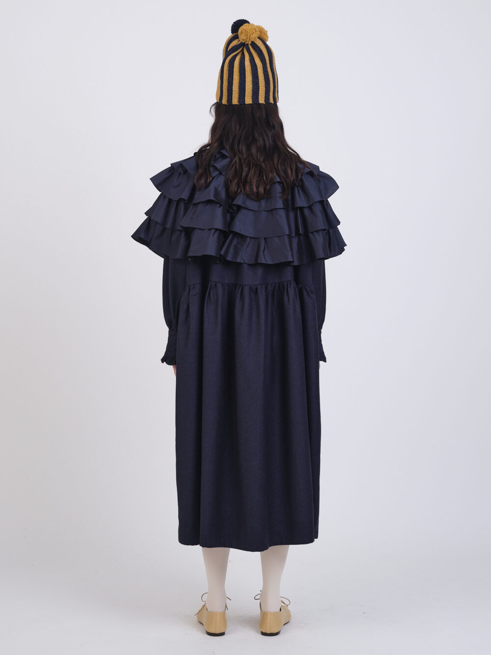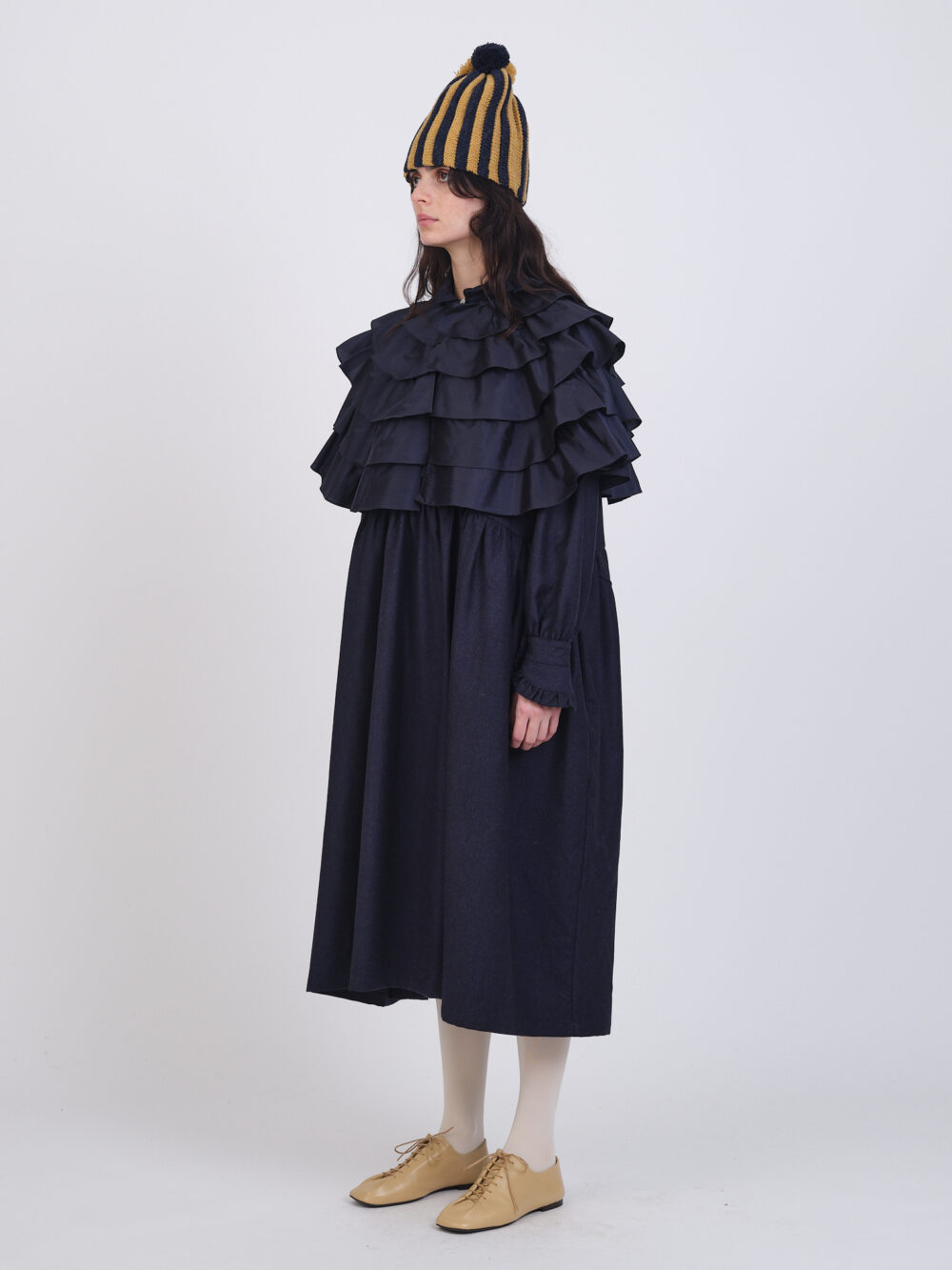 The Ruffle Cape features five layers of hand-gathered silk ruffles with a shell button and loop closure, a playful addition to any outfit.