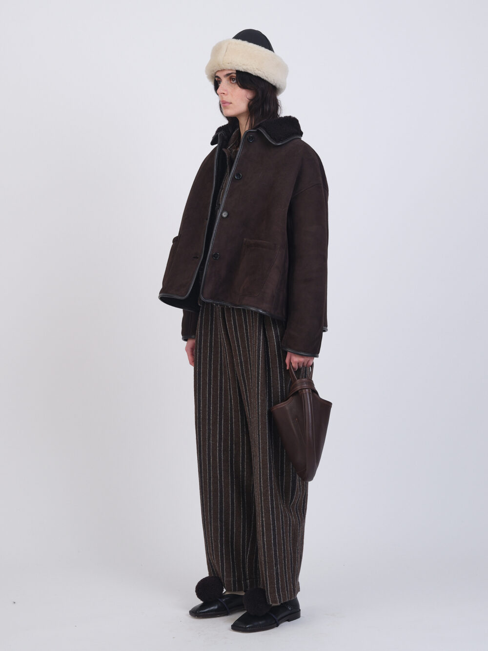Our classic a-line Avis Jacket, a customer favourite, in a reversible suede back with curly hair interior. Featuring a fur collar, patch pockets, leather nappa binding, and button closure.