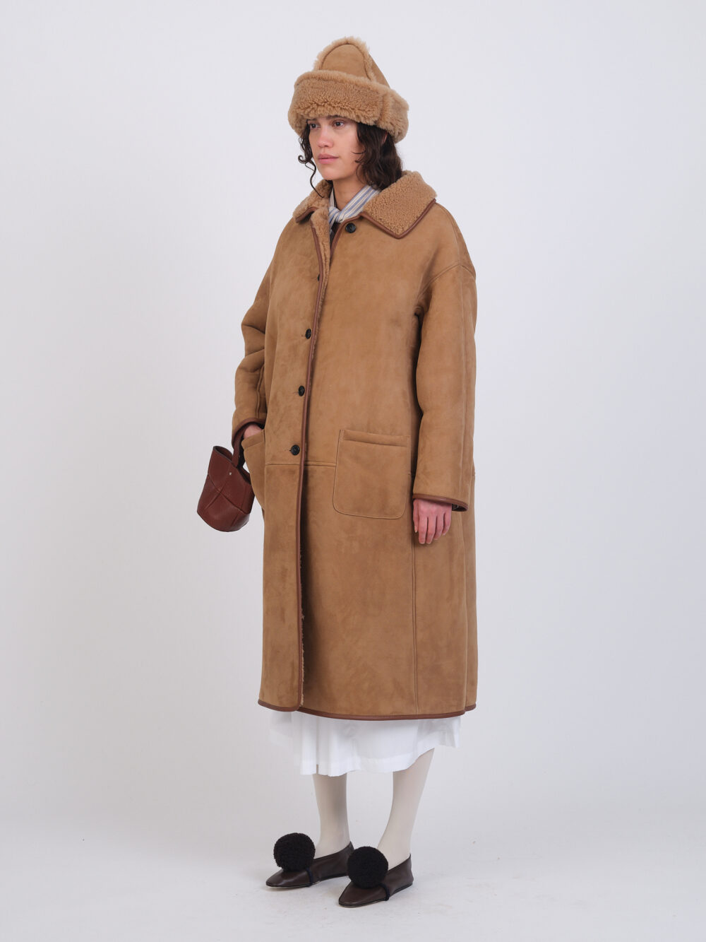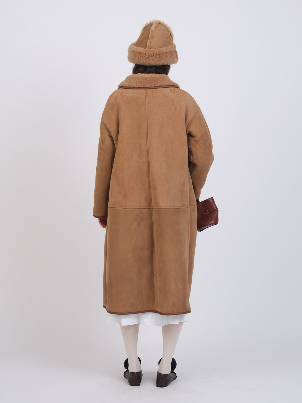 Our new, long Roo Coat in a reversible suede back with curly hair interior. Featuring a fur collar, patch pockets, leather nappa binding, and button closure.