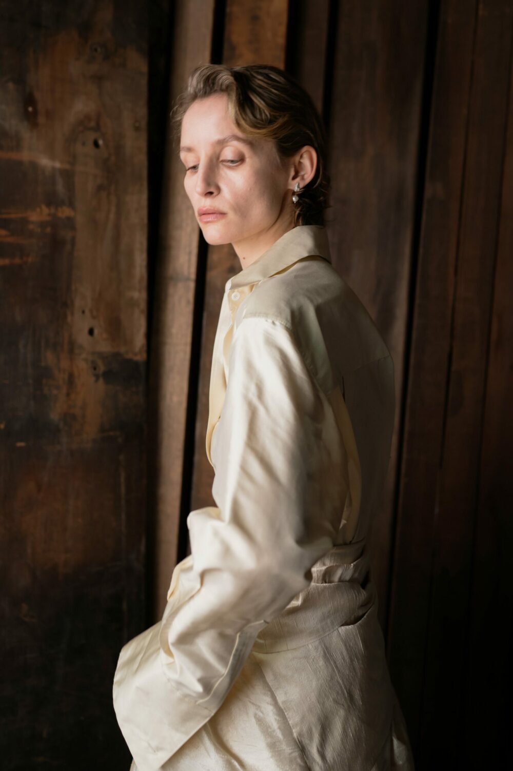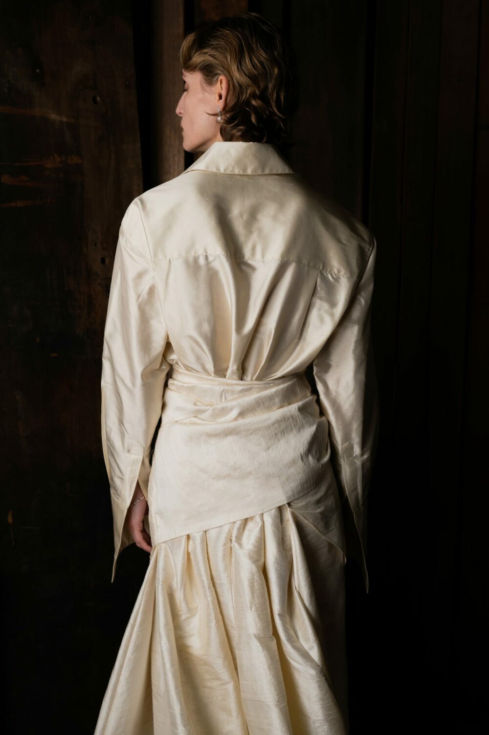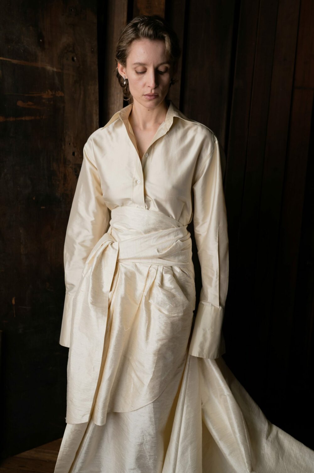 The Wedding Shirt is a classic button-down style with a crisp collar and long, cufflink-style cuffs. In a smooth silk dupion woven in India with shell buttons. The shirt pairs perfectly with the Tie Skirt for an elevated wedding look.